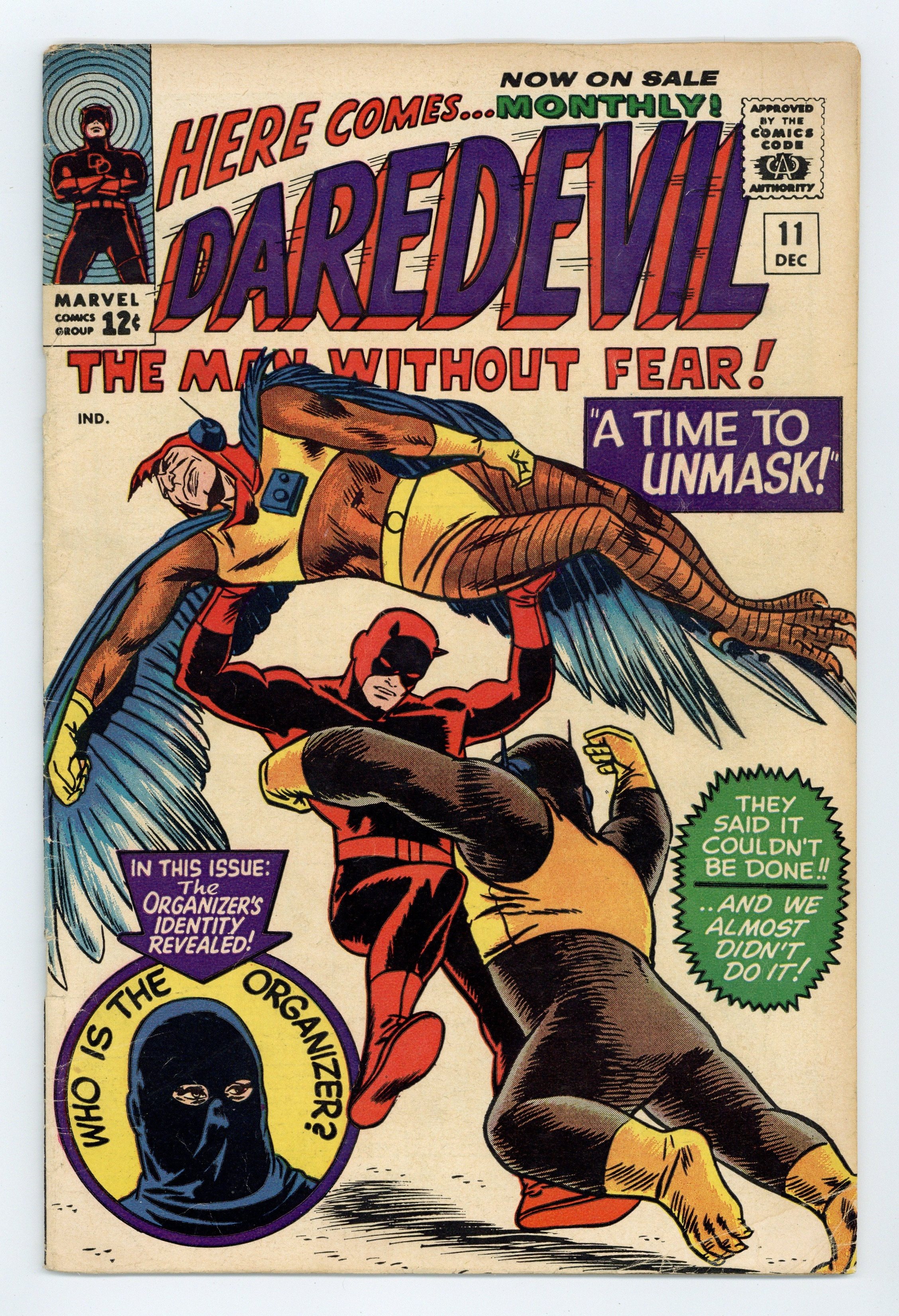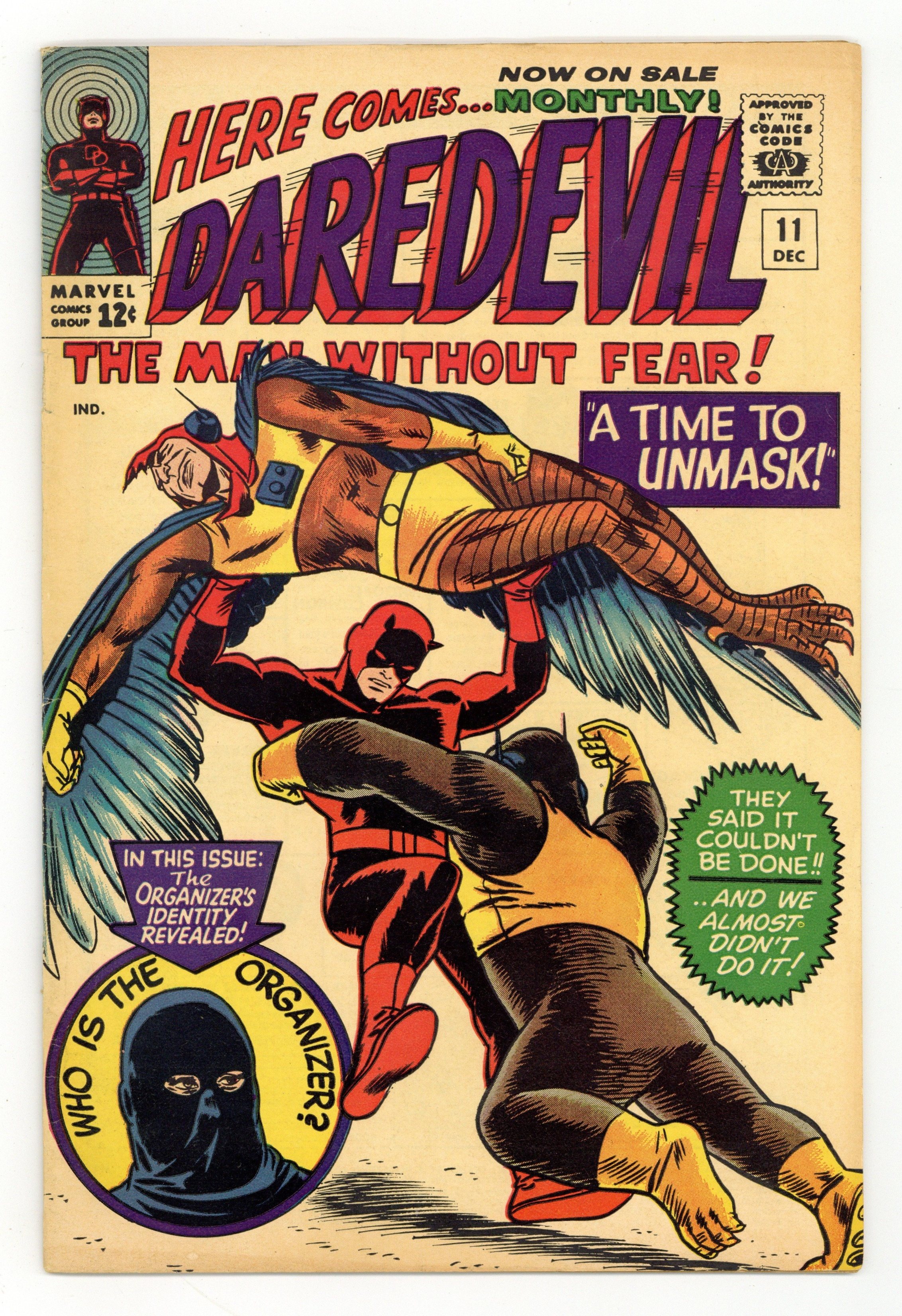 Tags: Marvel Legacy Numbering: Daredevil (part 11), Daredevil$43.00Cover pencils by Bob Powell, inks by Wally Wood. The Organizer returns with Ape Man, Bird Man, Cat Man, and Frog Man in A Time To Unmask!, script by Stan Lee, pencils by Bob Powell, inks by Wally Wood; The case of the Organizer and the Reform Party is wrapped up as mysteries are all solved; Matt takes a leave of absence from the law firm. 36 pgs. Cover price $0.12. Cover price $0.12.