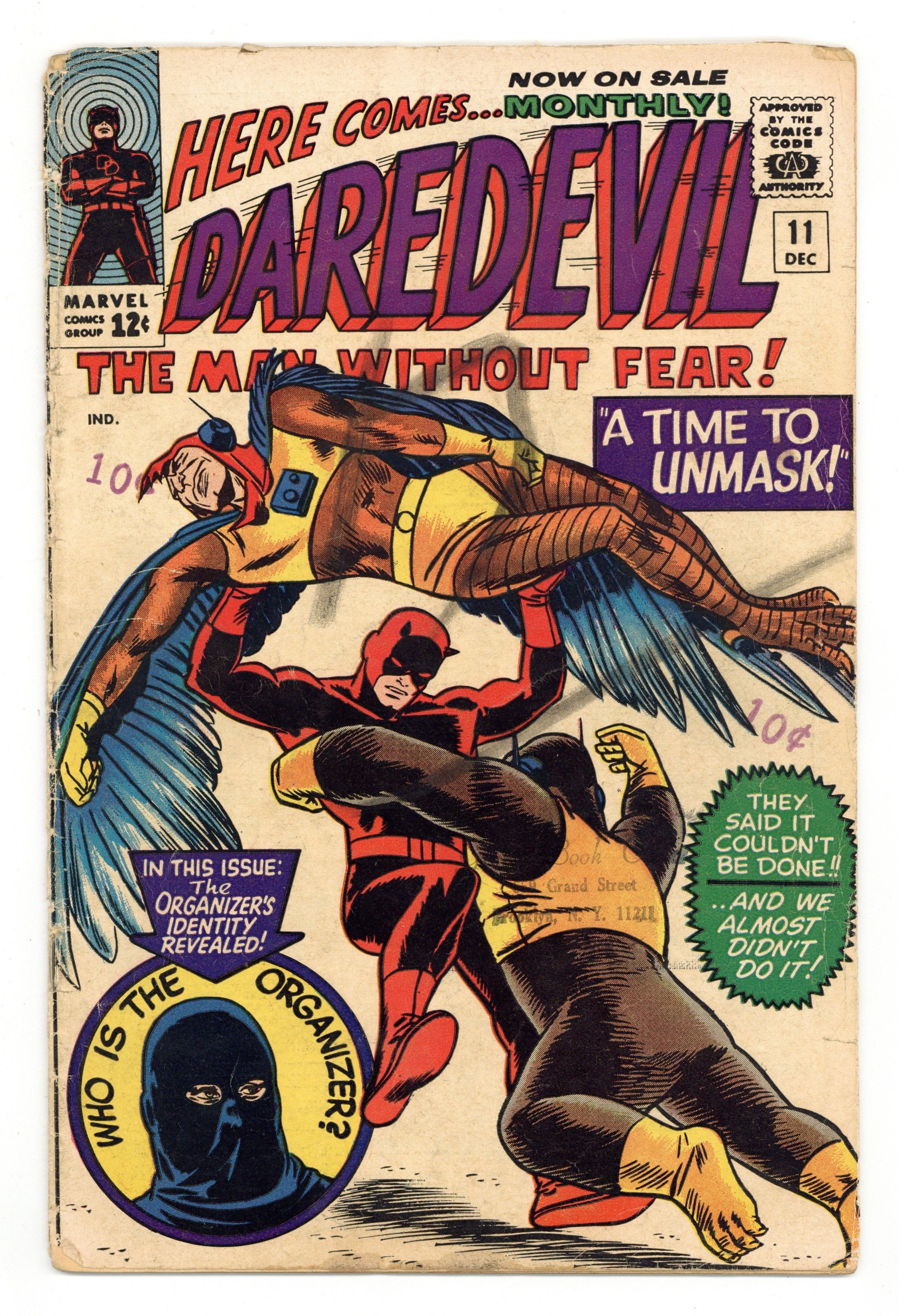 Tags: Marvel Legacy Numbering: Daredevil (part 11), Daredevil$29.00Cover pencils by Bob Powell, inks by Wally Wood. The Organizer returns with Ape Man, Bird Man, Cat Man, and Frog Man in A Time To Unmask!, script by Stan Lee, pencils by Bob Powell, inks by Wally Wood; The case of the Organizer and the Reform Party is wrapped up as mysteries are all solved; Matt takes a leave of absence from the law firm. 36 pgs. Cover price $0.12. Cover price $0.12.