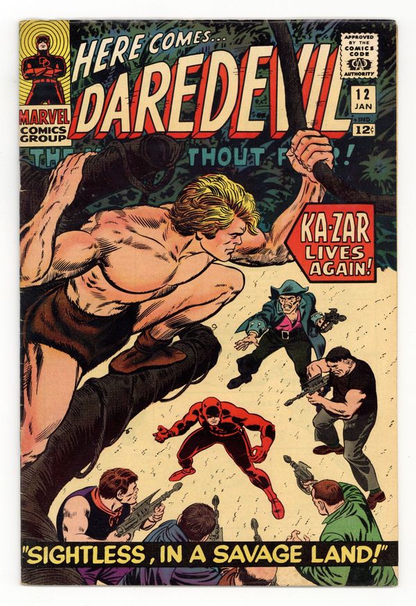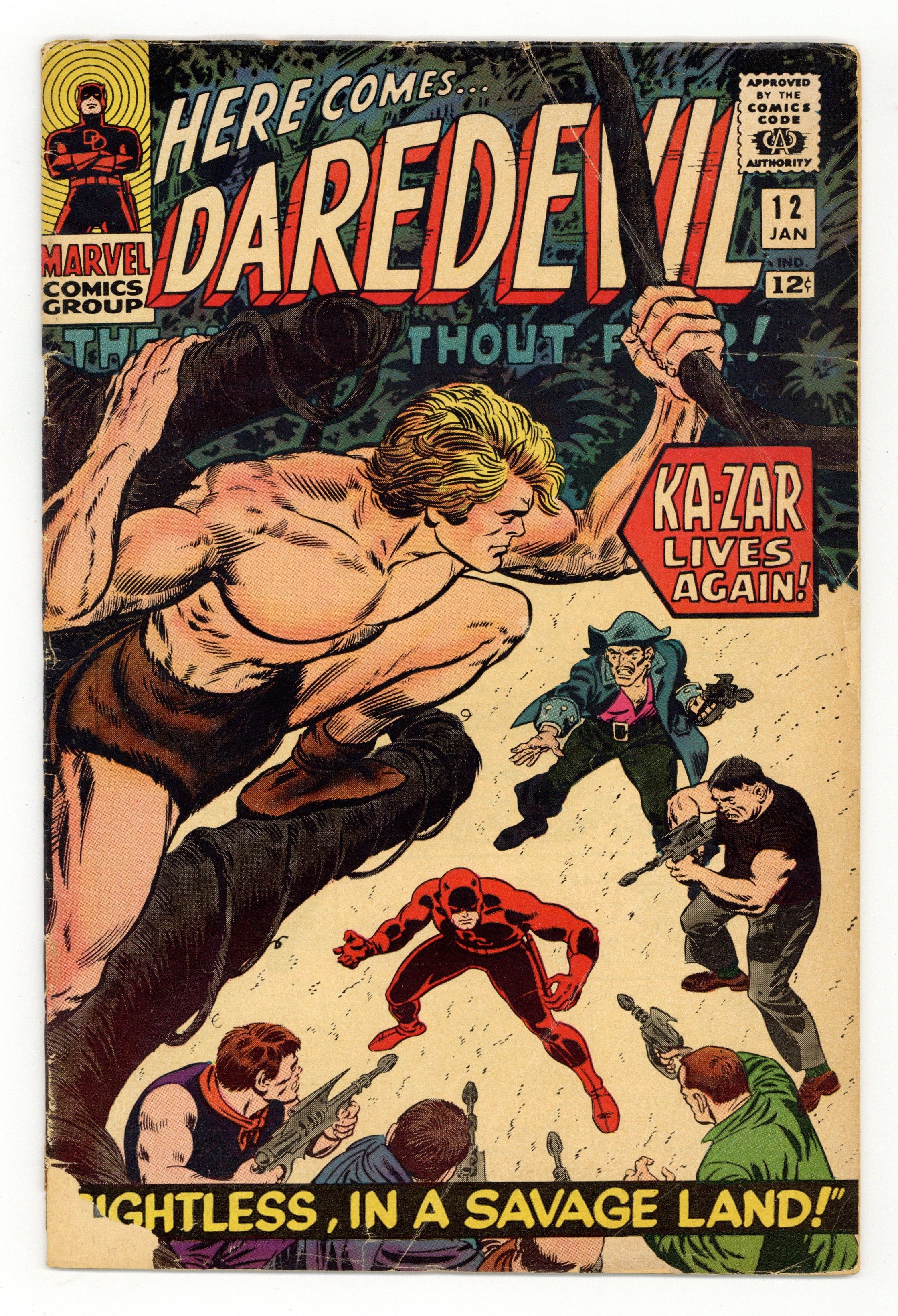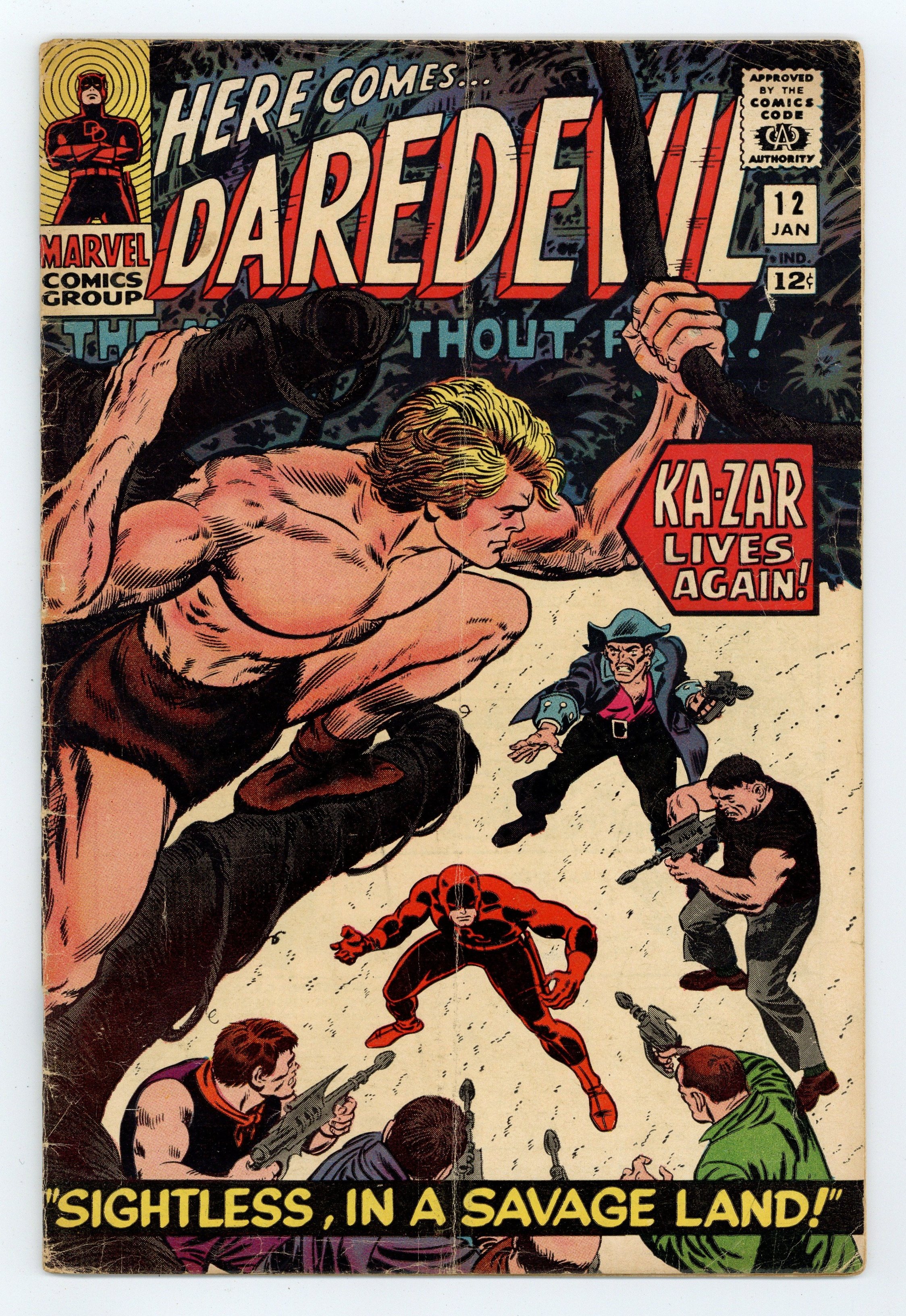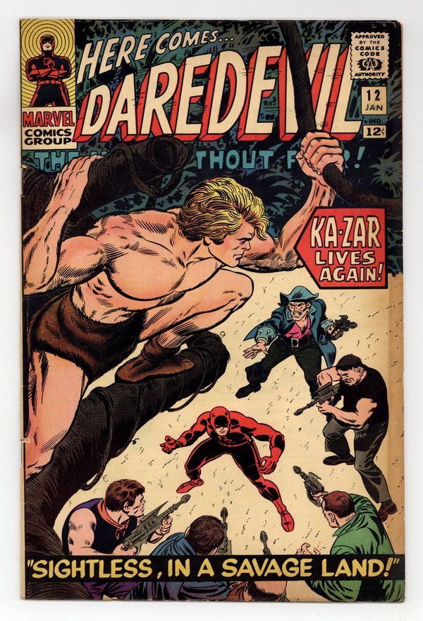 "Sightless, in a Savage Land!" Written by Stan Lee. Pencils byJack Kirby. Inks by John Romita Sr (1st comic work) Cover pencils by John Romita and Jack Kirby (Ka-Zar figure), inks by Vince Colletta and John Romita (retouches). Guest-starring Ka-Zar. Matt decides to take a cruise to get his mind off of Karen. After his cruise ship is boarded by pirates, DD is taken to the Savage Land by the Plunderer. Ka-Zar attacks the Plunderer for trespassing on his domain and saves Daredevil's life as his costume reminds the savage lord of his encounter with the X-Men. Cameos by the Sub-Mariner, the Organizer, Mr. Fear, Ape Man, Bird Man, Cat Man, Frog Man, Stilt-Man, the Matador, and the Owl. Note: First appearance of the Plunderer. Cover price $0.12.