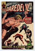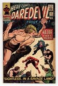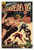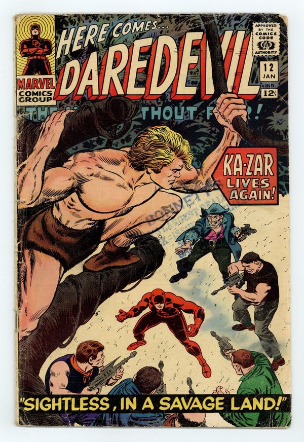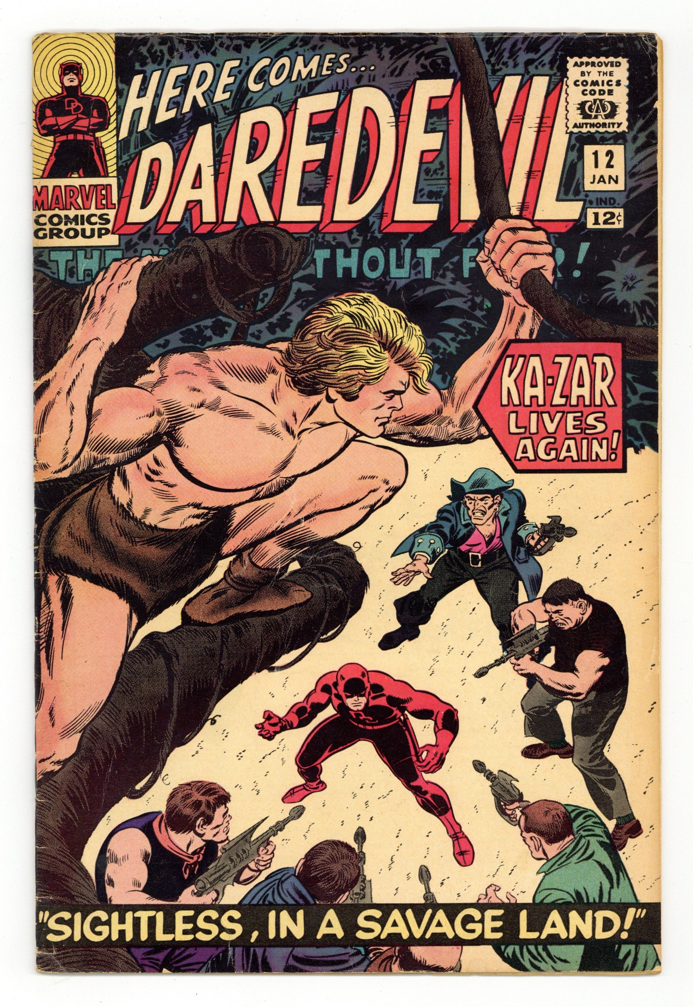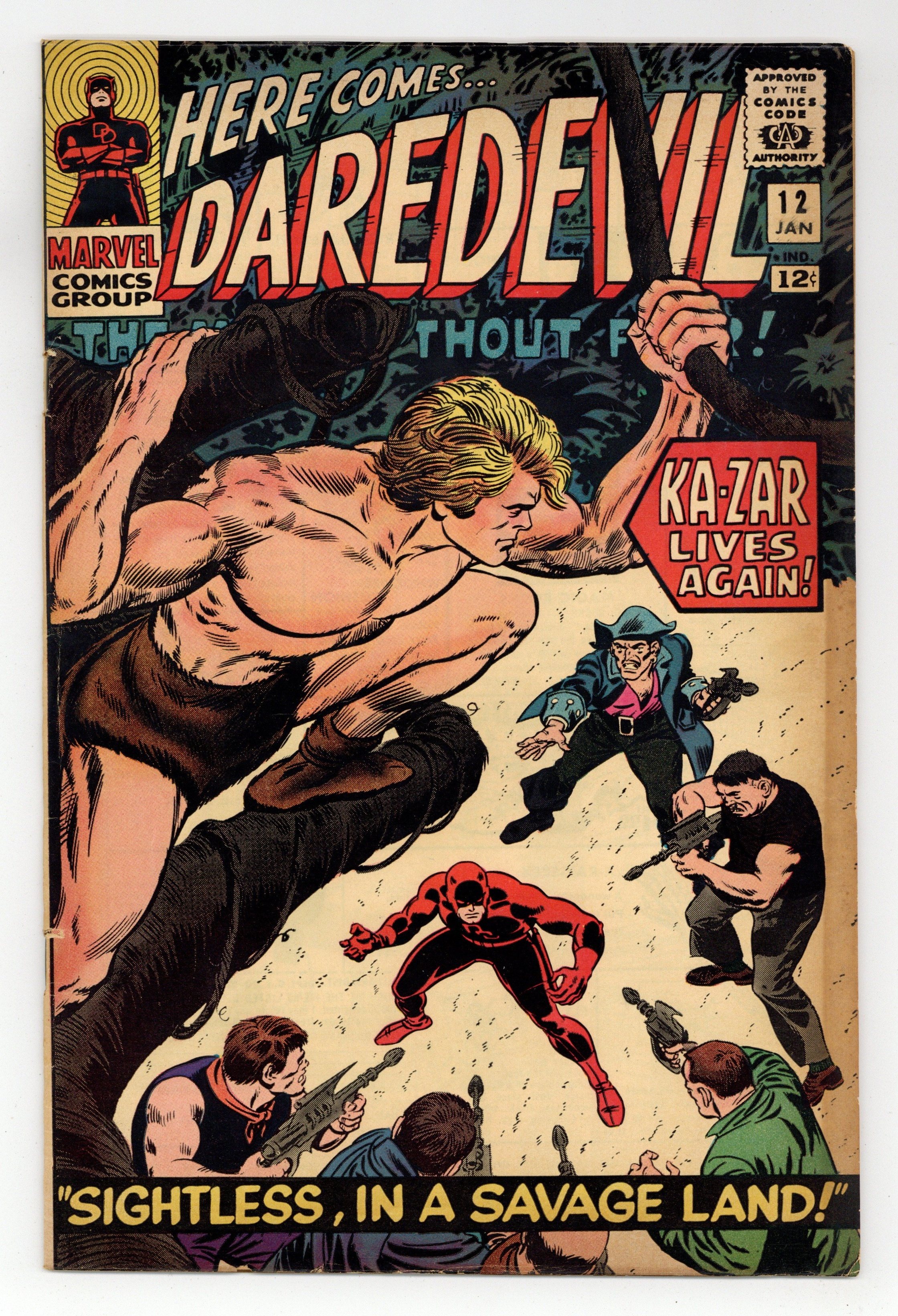 "Sightless, in a Savage Land!" Written by Stan Lee. Pencils byJack Kirby. Inks by John Romita Sr (1st comic work) Cover pencils by John Romita and Jack Kirby (Ka-Zar figure), inks by Vince Colletta and John Romita (retouches). Guest-starring Ka-Zar. Matt decides to take a cruise to get his mind off of Karen. After his cruise ship is boarded by pirates, DD is taken to the Savage Land by the Plunderer. Ka-Zar attacks the Plunderer for trespassing on his domain and saves Daredevil's life as his costume reminds the savage lord of his encounter with the X-Men. Cameos by the Sub-Mariner, the Organizer, Mr. Fear, Ape Man, Bird Man, Cat Man, Frog Man, Stilt-Man, the Matador, and the Owl. Note: First appearance of the Plunderer. Cover price $0.12.