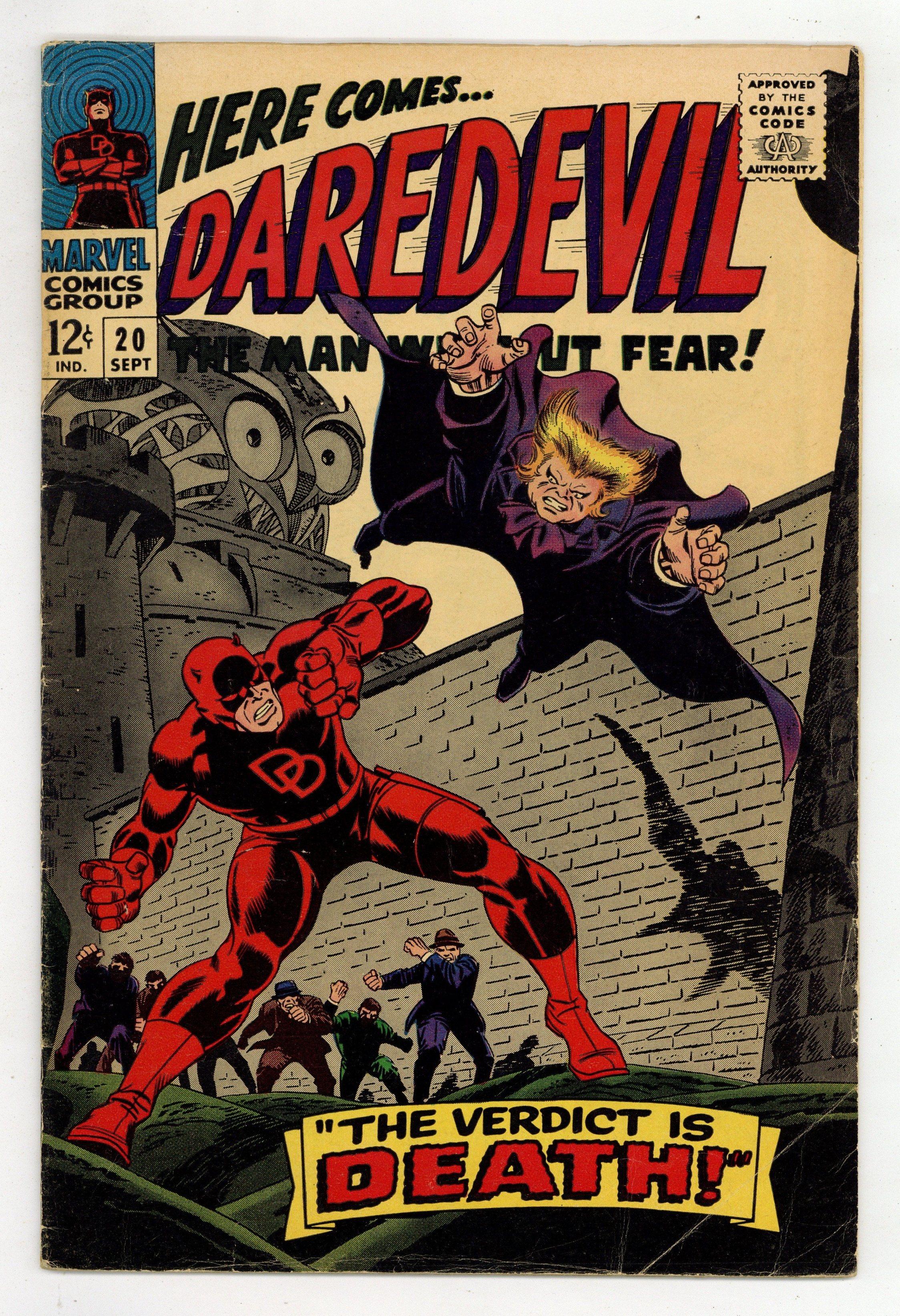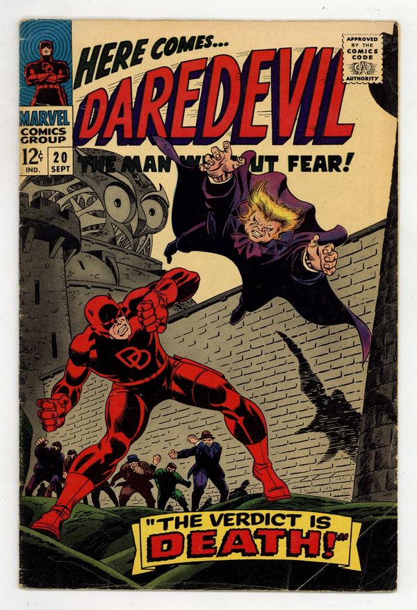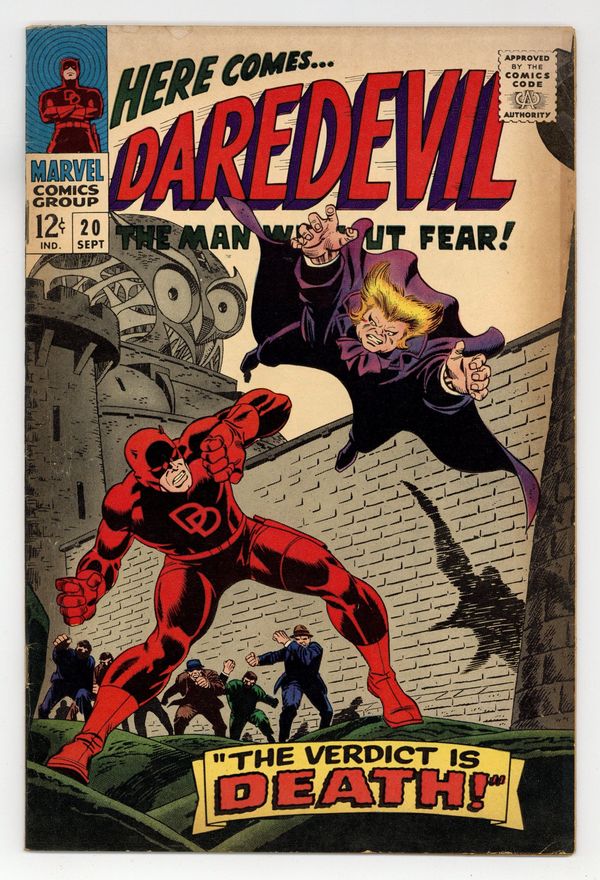 Cover pencils by John Romita, inks by Frank Giacoia. The Owl returns in The Verdict Is: Death!, script by Stan Lee, pencils by Gene Colan (first work on the title), inks by Frank Giacoia; The Owl kidnaps Matt Murdock to be the defense attorney in a mock trial the fowlish fiend has set up for the judge who sent him to prison. Reprinted in Giant-Size Marvel Triple Action #1. 36 pgs. Cover price $0.12. Cover price $0.12.