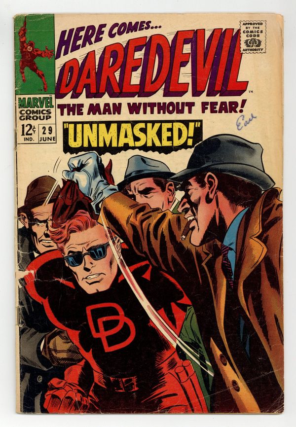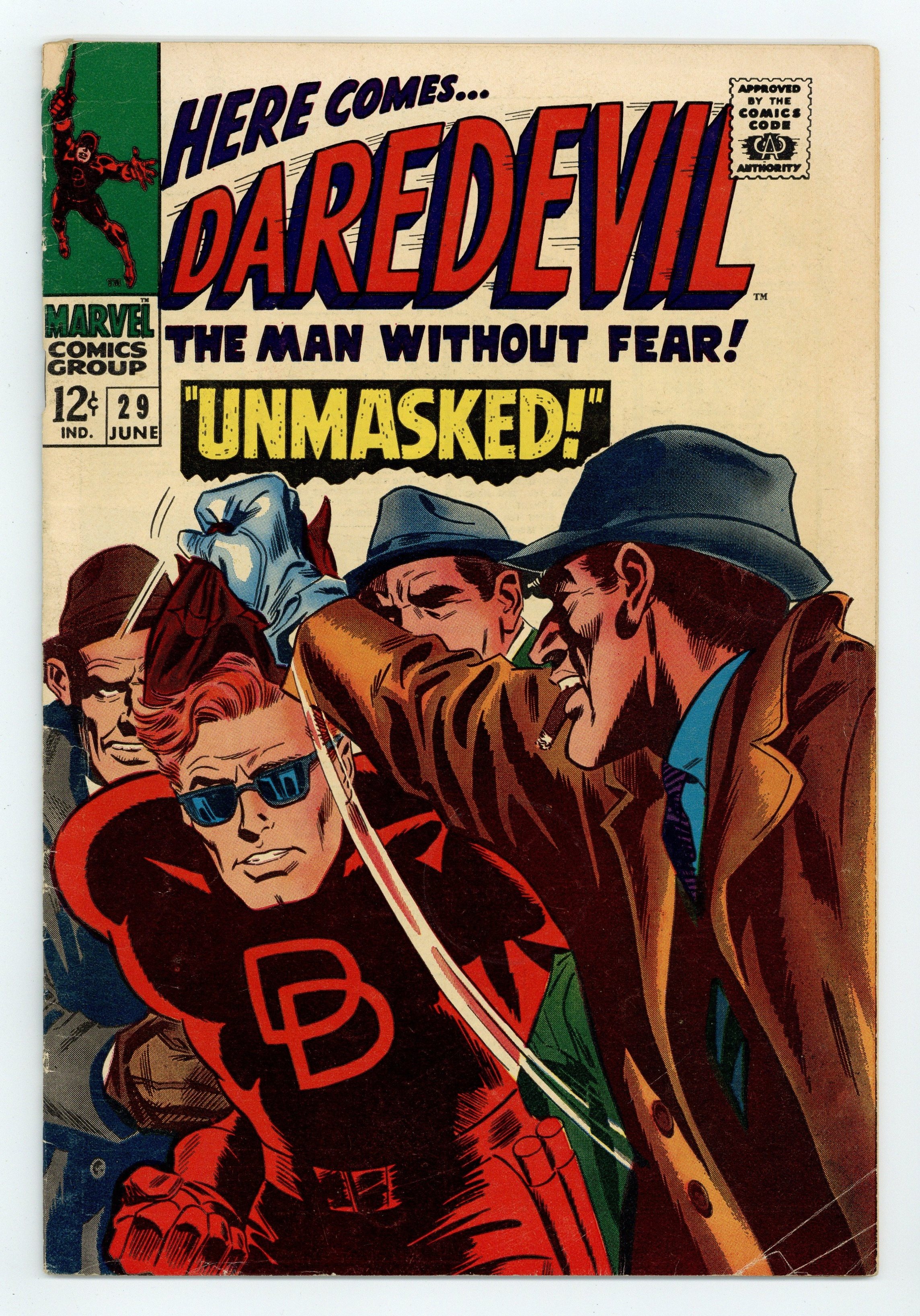 Cover pencils by Gene Colan, inks by Frank Giacoia. Unmasked, script by Stan Lee, pencils by Gene Colan, inks by John Tartaglione; Matt decides to propose to Karen but when she is kidnapped by The Boss to try and draw out Daredevil, he decides his lifestyle is too dangerous for domesticity and halts his plans. 36 pgs. Cover price $0.12. Cover price $0.12.