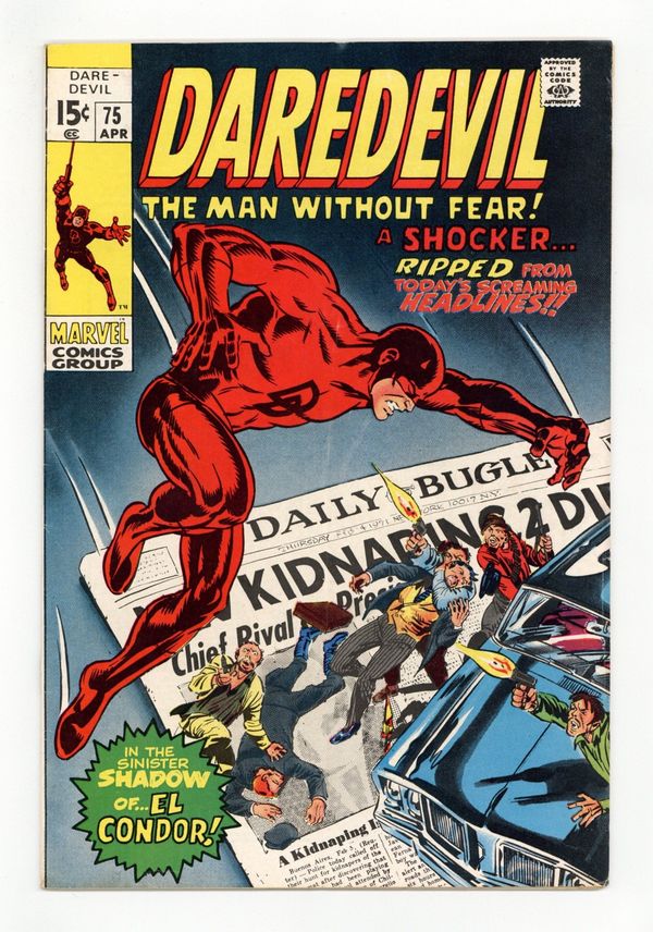 Tags: Marvel Legacy Numbering: Daredevil (part 75), Daredevil$17.00Cover pencils by Marie Severin, inks by Herb Trimpe. First appearance of El Condor in Now Rides the Ghost of El Condor!, script by Gerry Conway, art by Gene Colan; Matt and Foggy are in South America when they get embroiled in a revolution started by El Condor. 36 pgs. Cover price $0.15. Cover price $0.15.