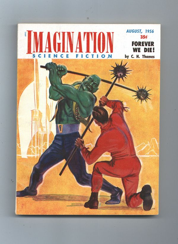 Published Aug 1956 by Greenleaf Publishing.$24.00Vol. 7, No. 4. August 1956. Novel: "Forever We Die!" by C. H. Thames. Short Stories: "We Run From the Hunted!" by Darius John Granger, "The Man with the Golden Eyes" by Alexander Blade, "Traitor's Choice" by Paul W. Fairman, and "Next Stop, Nowhere!" by Dick Purcell. 5.5" x 7.25". 130 pages. Cover price $0.35.