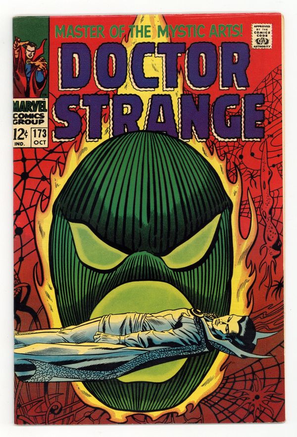 Tags: Marvel Legacy Numbering: Doctor Strange (part 173)$15.00Cover art by Dan Adkins. While a World Waits!, script by Roy Thomas, pencils by Gene Colan, inks by Tom Palmer; Umar frees Strange, via suggestion from Clea and Victoria Bentley; Dormammu defeated by his own vow never to enter the Earth dimension; curse returns him to the Dark Dimension; Dr. Benton, former medical colleague, offers consultant position to Strange. Cover price $0.12.