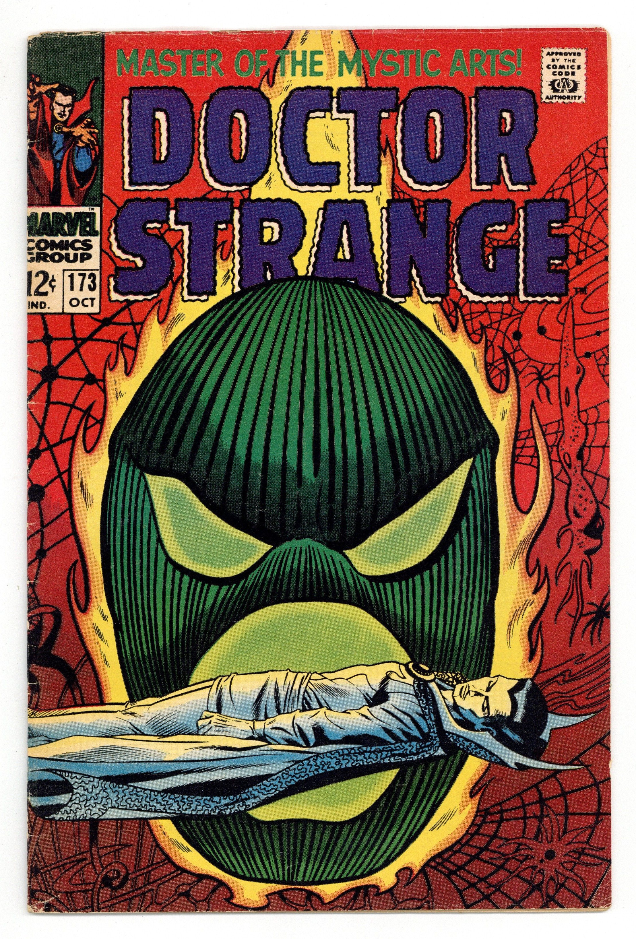 Tags: Marvel Legacy Numbering: Doctor Strange (part 173)$22.00Cover art by Dan Adkins. While a World Waits!, script by Roy Thomas, pencils by Gene Colan, inks by Tom Palmer; Umar frees Strange, via suggestion from Clea and Victoria Bentley; Dormammu defeated by his own vow never to enter the Earth dimension; curse returns him to the Dark Dimension; Dr. Benton, former medical colleague, offers consultant position to Strange. Cover price $0.12.