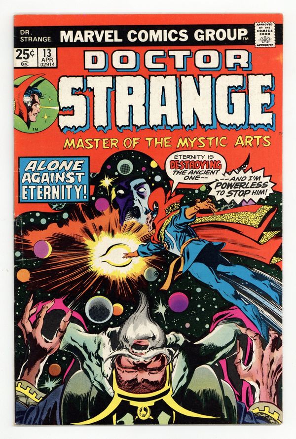 Cover pencils by Gene Colan, inks by Tom Palmer. Planet Earth is No More!, script by Steve Englehart, pencils by Gene Colan, inks by Tom Palmer; Strange enters Dimension of Dreams, defeats Nightmare, & releases Eternity. Nightmare had caused Eternity to dream the end of the Earth; The Ancient One intervenes, & Eternity recreates Earth. Appearance by Clea. Story continues in Tomb of Dracula 44. The letters page contains Marvel Value Stamp series B #72 (Thor by Jack Kirby). Cover price $0.25.