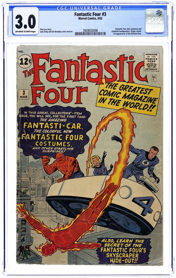 First 12-cent issue. Cover pencils by Jack Kirby, inks by Sol Brodsky. First appearance of the Miracle Man in "The Menace of the Miracle Man!", script by Stan Lee, pencils by Jack Kirby, inks by Sol Brodsky; The Miracle Man performs his super-villain debut at his magic show by humiliating the Thing. Johnny Storm the Human Torch! Pin-Up Page, pencils by Jack Kirby, inks by Sol Brodsky. Chapter II "The Monster Lives!"; Miracle Man declares war on humanity and animates a movie monster statue. Chapter III "The Flame that Died!"; Human Torch torches the animated Monster from Mars-statue and Invisible Girl stowes away on the atomic tank that Miracle Man has stolen. Chapter IV "In the Shadow of Defeat!"; The Thing recalls the origin of the Fantastic Four while the Invisible Girl is taken prisoner by Miracle Man. Chapter V "The Final Challenge!" This issue features the first appearances of the FF costumes and the Fantasticar. First FF letters page; letter to the editor from comics artist Alan Weiss. (For the original, unused Kirby/Dick Ayers cover to this issue, see Fantastic Four 224.) 36 pgs. $0.12. Cover price $0.12.