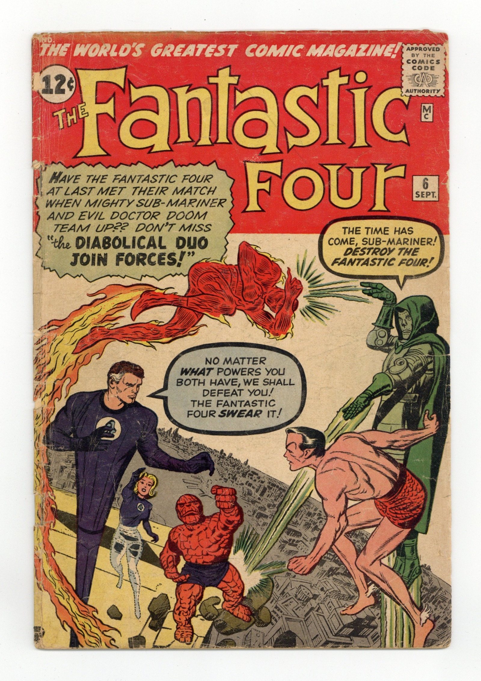 Cover pencils by Jack Kirby, inks by Dick Ayers. Dr. Doom and the Sub-Mariner team up (first Marvel villian team-up and second Silver Age Sub-Mariner appearance) in "Captives of the Deadly Duo!" Part 1, script by Stan Lee, pencils by Jack Kirby, inks by Dick Ayers; Doctor Doom presents himself to Sub-Mariner and offers him an alliance against the Fantastic Four and all mankind. When Super-Menaces Unite Part 2; Dr. Doom gives a "Grabber" to Sub-Mariner and Human Torch discovers that Invisible Girl hides a photo of the Sub-Mariner in a book. Part 3 When Friends Fall Out!; The Sub-Mariner plants the "Grabber" in the Baxter Building and it is lifted into space by Doctor Doom. Part 4 Trapped!; The Baxter Building is set on a collision course with the Sun and the Sub-Mariner discovers that Doctor Doom has betrayed him. Part 5 The End... or the Beginning?; Doctor Doom is flung out into space and the Baxter Building is returned to its foundation. First mention of "unstable molecules." 36 pgs. $0.12. Cover price $0.12.