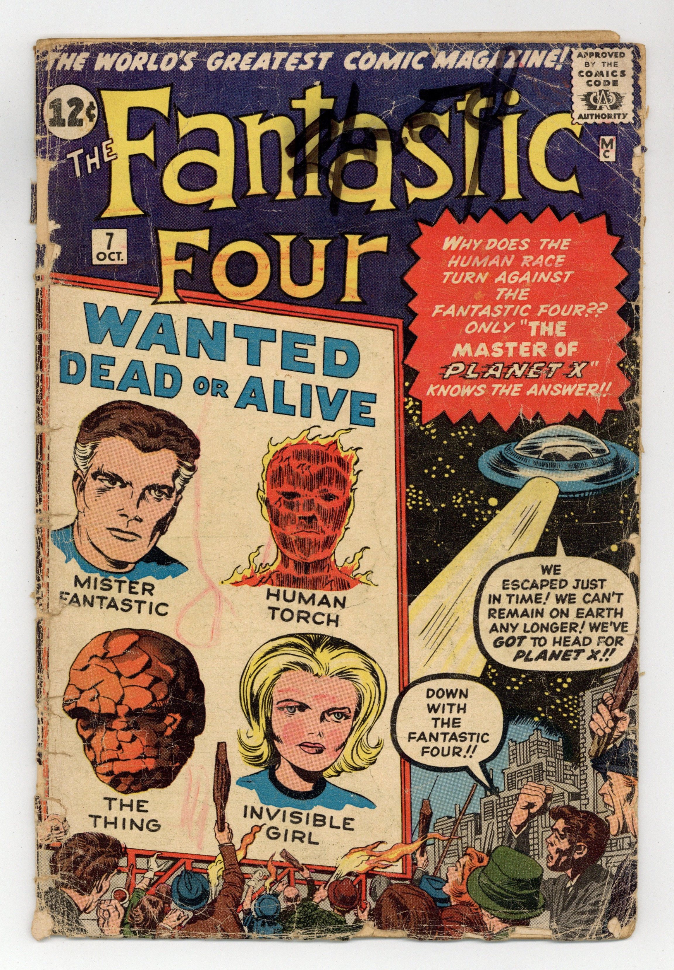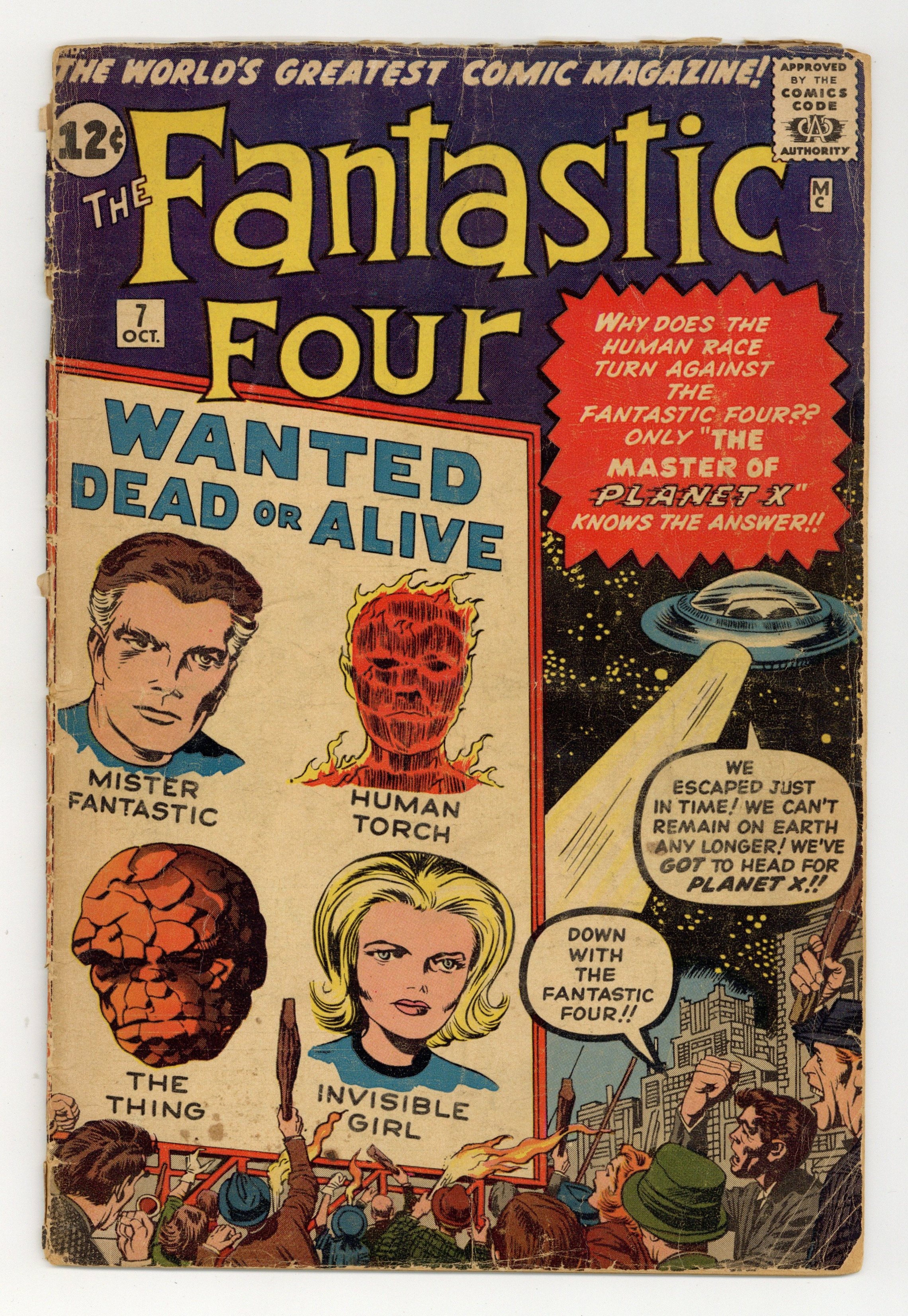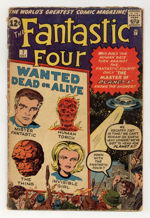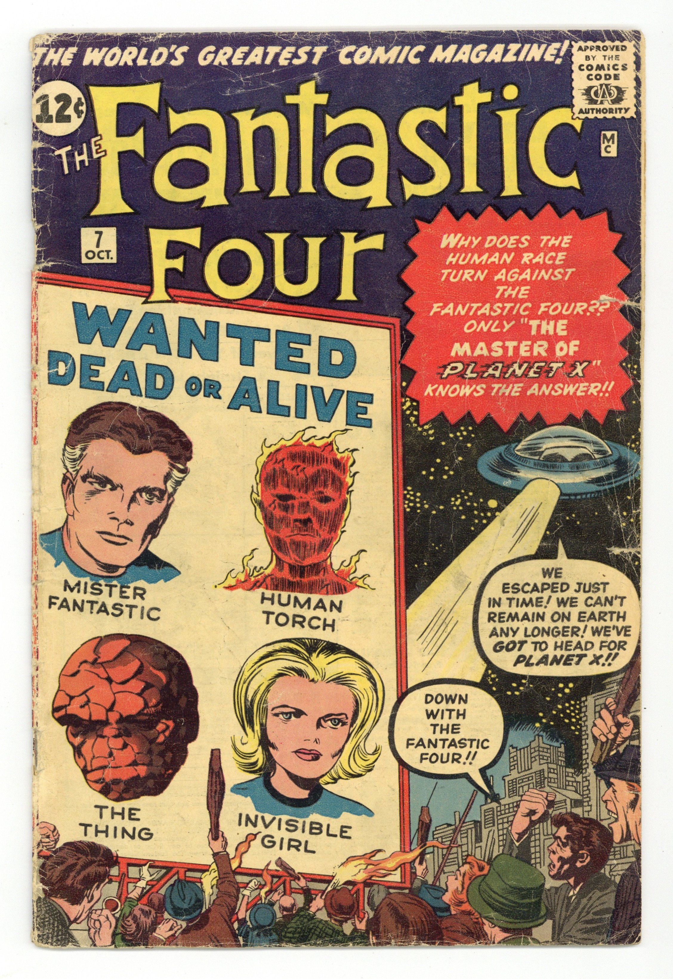Cover art by Jack Kirby. First appearance of Kurrgo in "Prisoners of Kurrgo, Master of Planet X! Part 1 It Came From the Skies!, script by Stan Lee, pencils by Jack Kirby, inks by Dick Ayers; Kurrgo sends a robot to take the Fantastic Four to Planet X. Part 2 Outlawed; The robot from Planet X puts on a "hostility ray" to make people riot against the Fantastic Four. Part 3 "Bound for Planet X!"; The robot grants the Fantastic Four asylum on Planet X. Part 4 "Twenty Four Hours till Zero!"; Kurrgo orders the Fantastic Four to save his people from Planet X' destruction. Part 5 "The End of Planet X!"; Kurrgo perishes on Planet X, but his people gets away from its destruction. 36 pgs. $0.12. Cover price $0.12.