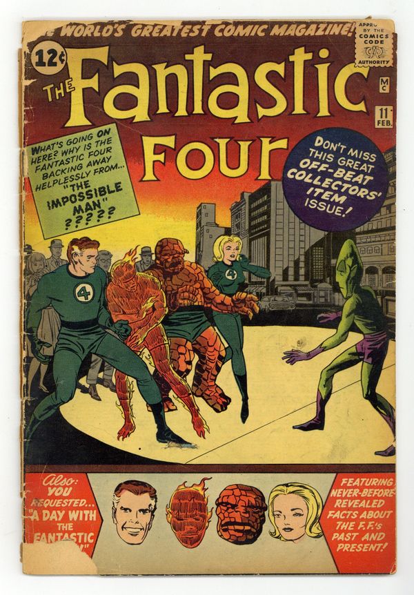Cover art by Jack Kirby. Origin and first appearance of the Impossible Man in "The Impossible Man!", script by Stan Lee, pencils by Jack Kirby, inks by Dick Ayers; The police call the Fantastic four to help against a childish extra-terrestrial. A Visit with the Fantastic Four, script by Stan Lee, pencils by Jack Kirby, inks by Dick Ayers; Willie Lumpkin (first appearance) brings to the Fantastic Four their huge mailbag; It makes them think about their youths and their origin. Cameos by Skrulls and Doctor Doom. Pin-up of Namor and his undersea headquarters, pencils by Jack Kirby, inks by Dick Ayers. 36 pgs. $0.12. Cover price $0.12.