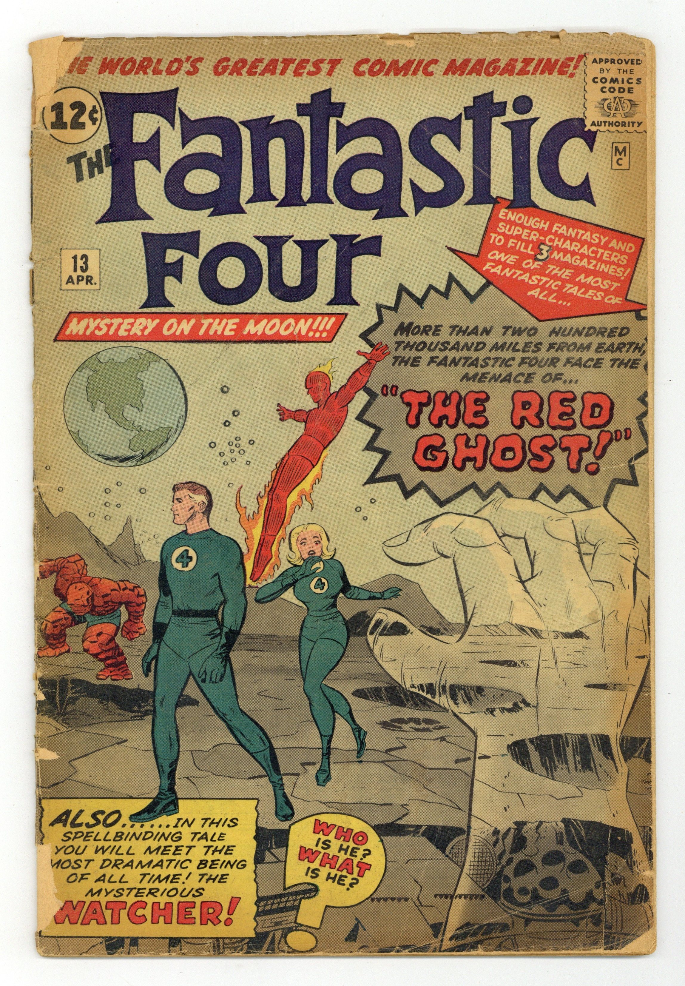 Starts Jul 4 Cover pencils by Jack Kirby, inks by George Roussos. First appearance of The Watcher and the Red Ghost in The Fantastic Four Versus the Red Ghost and His Indescribable Super-Apes!, script by Stan Lee, pencils by Jack Kirby, inks by Steve Ditko; While Reed prapares a journey to the Blue Area of the Moon, Ivan Kragoff trains three apes to pilot a spaceship and take possession of the Moon "for the communist empire." Part 2 Menace on the Moon!; In space, the Fantastic Four's ship crosses that of Ivan Kragoff and they learn of the powers the apes have acquired before landing on the moon. Part 3 "The Watcher Appears!"; The Watcher appears and explains where he comes from and why he cannot take sides in the battle between the Fantastic Four and the Red Ghost. Part 4 "Duel in the Dead City!"; The Fantastic Four battles the Red Ghost and his super-apes on the Moon. 36 pgs. $0.12. Cover price $0.12.