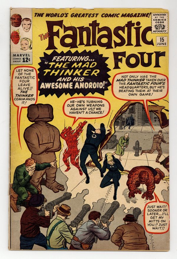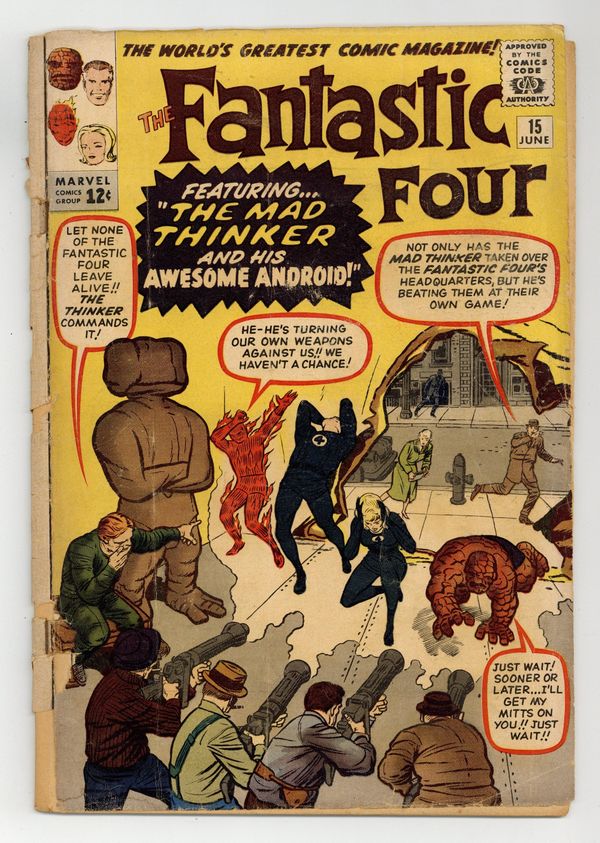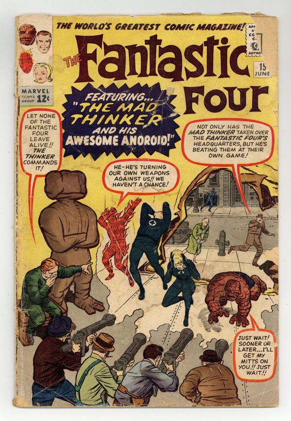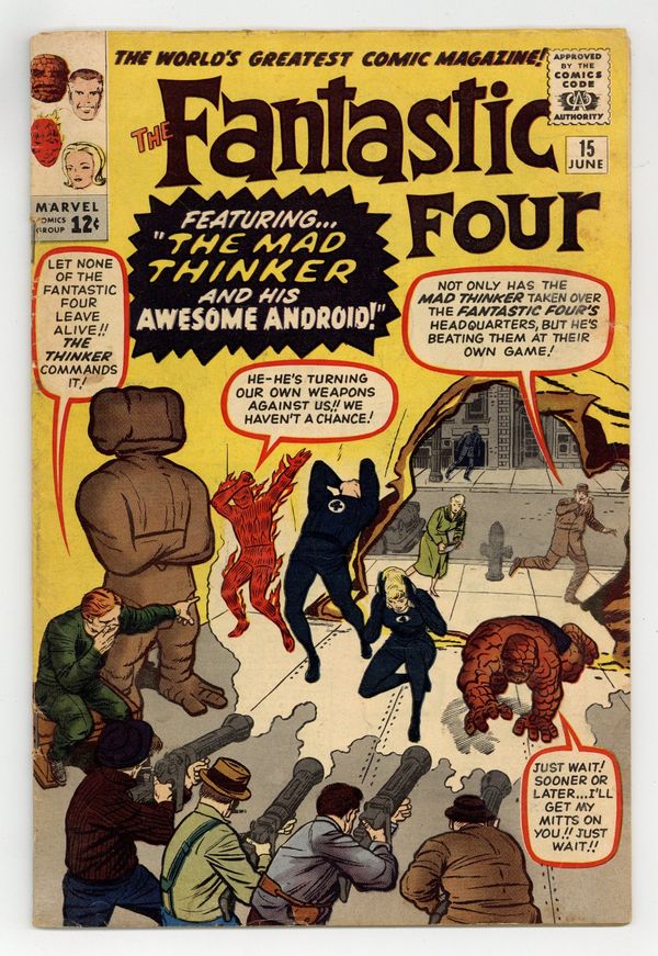 Ends Dec 8 8:16 PM CST Bid History 16 bids Current Bid $105 Your Secret Max Bid If you'd like to bid, please log in or register. Cover pencils by Jack Kirby, inks by Dick Ayers. First appearance of the Mad Thinker in "The Fantastic Four Battle the Mad Thinker and His Awesome Android!", script by Stan Lee, pencils by Jack Kirby, inks by Dick Ayers; The Mad Thinker has summoned gang leaders to try to become the king of New-York; To achieve his goal, he must defeat the Fantastic Four; So he makes sure they are all offered interesting opportunities; While they disband, the Thinker uses the Baxter Building to build his Awesome Android. The Fantastic Four Pin-Up Page, script by Stan Lee, pencils by Jack Kirby, inks by Dick Ayers. Half-page ads for Sgt. Fury # 1 and the next issue of Fantastic Four. Fantastic Four Fan Clubs ad. 36 pgs. $0.12. Cover price $0.12.