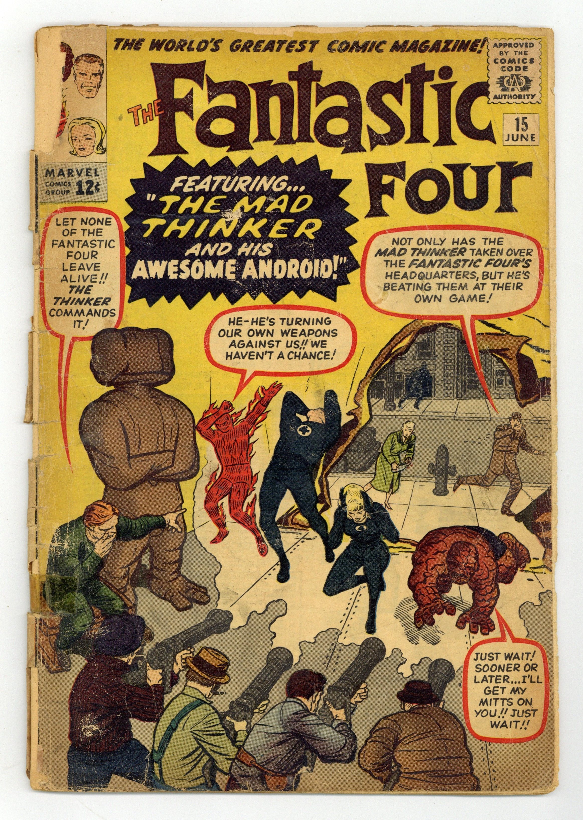 Cover pencils by Jack Kirby, inks by Dick Ayers. First appearance of the Mad Thinker in "The Fantastic Four Battle the Mad Thinker and His Awesome Android!", script by Stan Lee, pencils by Jack Kirby, inks by Dick Ayers; The Mad Thinker has summoned gang leaders to try to become the king of New-York; To achieve his goal, he must defeat the Fantastic Four; So he makes sure they are all offered interesting opportunities; While they disband, the Thinker uses the Baxter Building to build his Awesome Android. The Fantastic Four Pin-Up Page, script by Stan Lee, pencils by Jack Kirby, inks by Dick Ayers. Half-page ads for Sgt. Fury # 1 and the next issue of Fantastic Four. Fantastic Four Fan Clubs ad. 36 pgs. $0.12. Cover price $0.12.