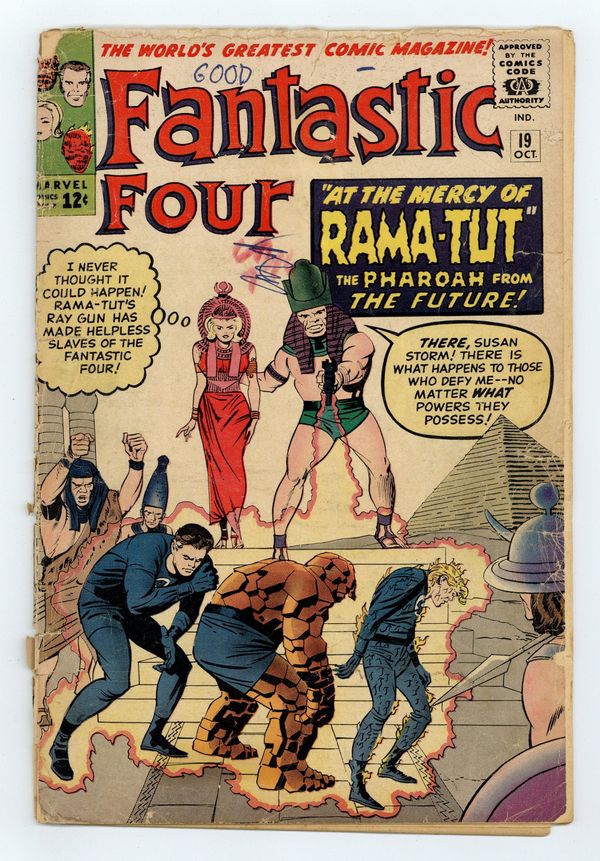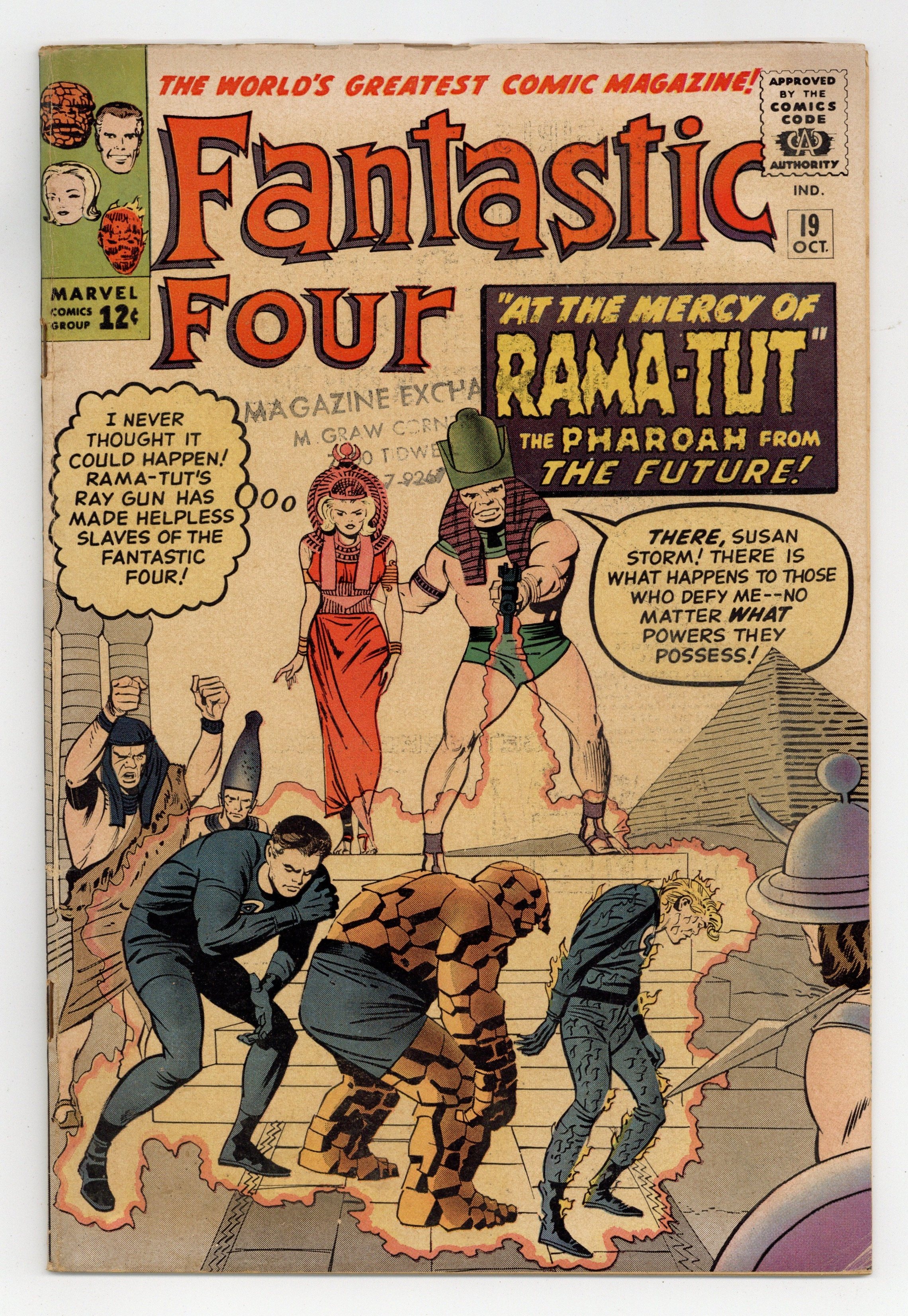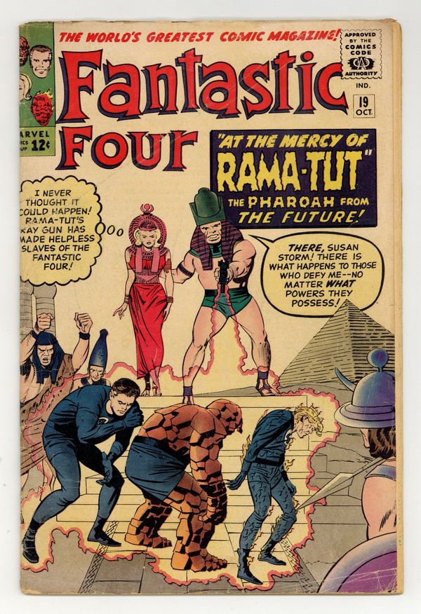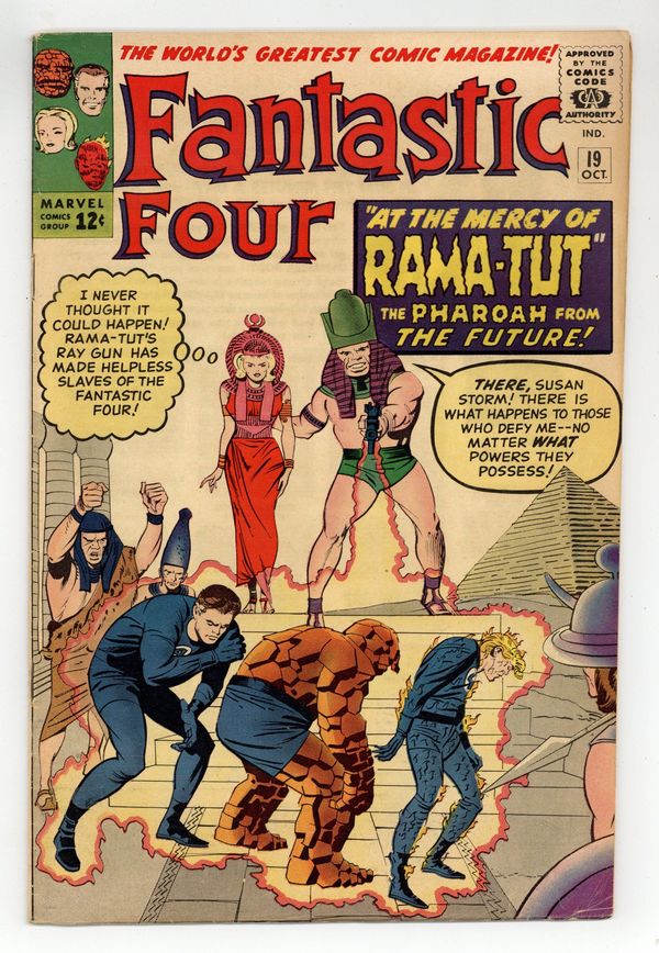 Cover pencils by Jack Kirby, inks by Paul Reinman. First appearance of Pharaoh Rama-Tut in "Prisoners of the Pharoah!, script by Stan Lee, pencils by Jack Kirby, inks by Dick Ayers; The Fantastic Four return to Ancient Egypt to try to find a cure for Alicia's blindness and are met by Rama-Tut, a time traveler from the year 3000. Cameos by the Mole Man, the Puppet Master, the Super-Skrull, and Doctor Doom. Letter to the editor from comics writer Steve Gerber. The events of this very issue can be seen from different points of view in the pages of Doctor Strange (1974 2nd Series) #53 and Avengers West Coast (1985) #22. 36 pgs. $0.12. Cover price $0.12.