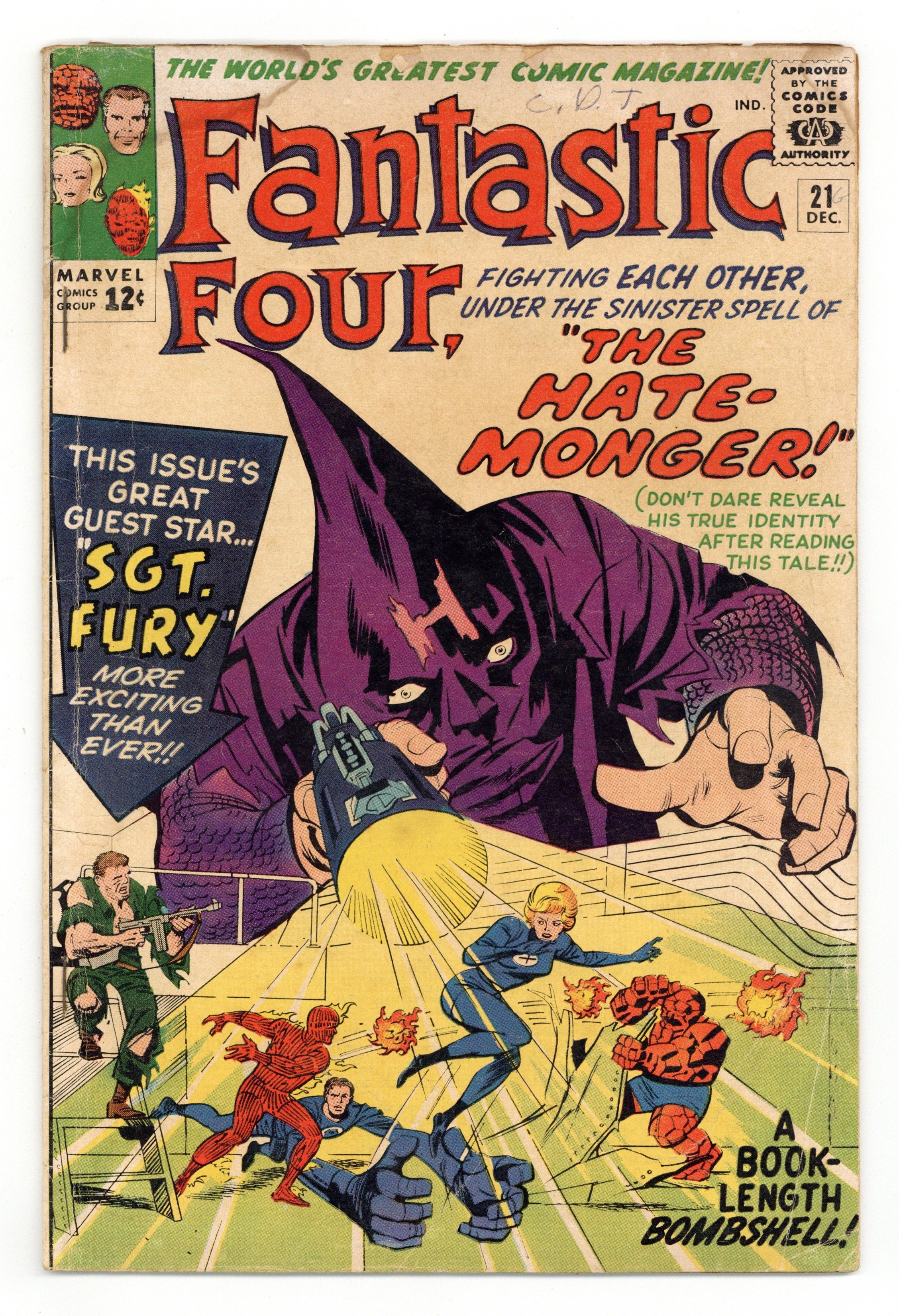 Cover pencils by Jack Kirby, inks by Paul Reinman. First appearance of the Hate-Monger in "The Hate-Monger!", script by Stan Lee, pencils by Jack Kirby, inks by George Roussos [as George Bell]; Nick Fury, now a colonel in the CIA, enlist the aid or the Fantastic Four against the Hate-Monger even though they are under the control of his Hate-Ray. First Sgt. Fury cross-over. Spider-Man cameo. 36 pgs. $0.12. Cover price $0.12.
