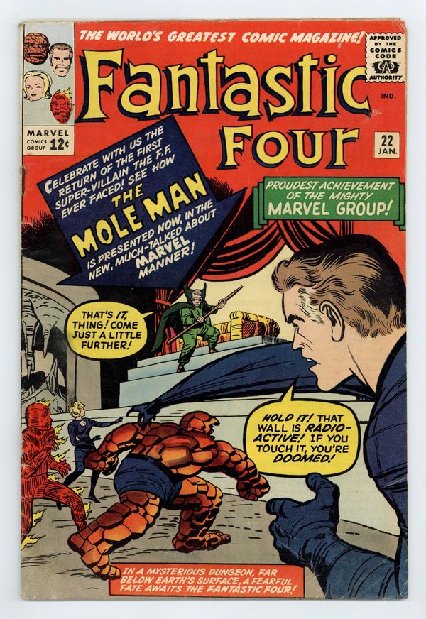 Cover pencils by Jack Kirby, inks by Dick Ayers. The Return of the Mole Man!, script by Stan Lee, pencils by Jack Kirby, inks by George Roussos [as G. Bell]; The Mole Man arranges for the neighbors of the Fantastic Four to complain about their activities so they will be interested when they receive an ad for an island that is for sale; When they visit the island, the Mole Man is waiting for them. Letters to the editor from comics writer Roy Thomas, comics artist Dave Cockrum, Wayne Howard (the comics artist?), and Steve Erickson (the writer?). 36 pgs. $0.12. Cover price $0.12.