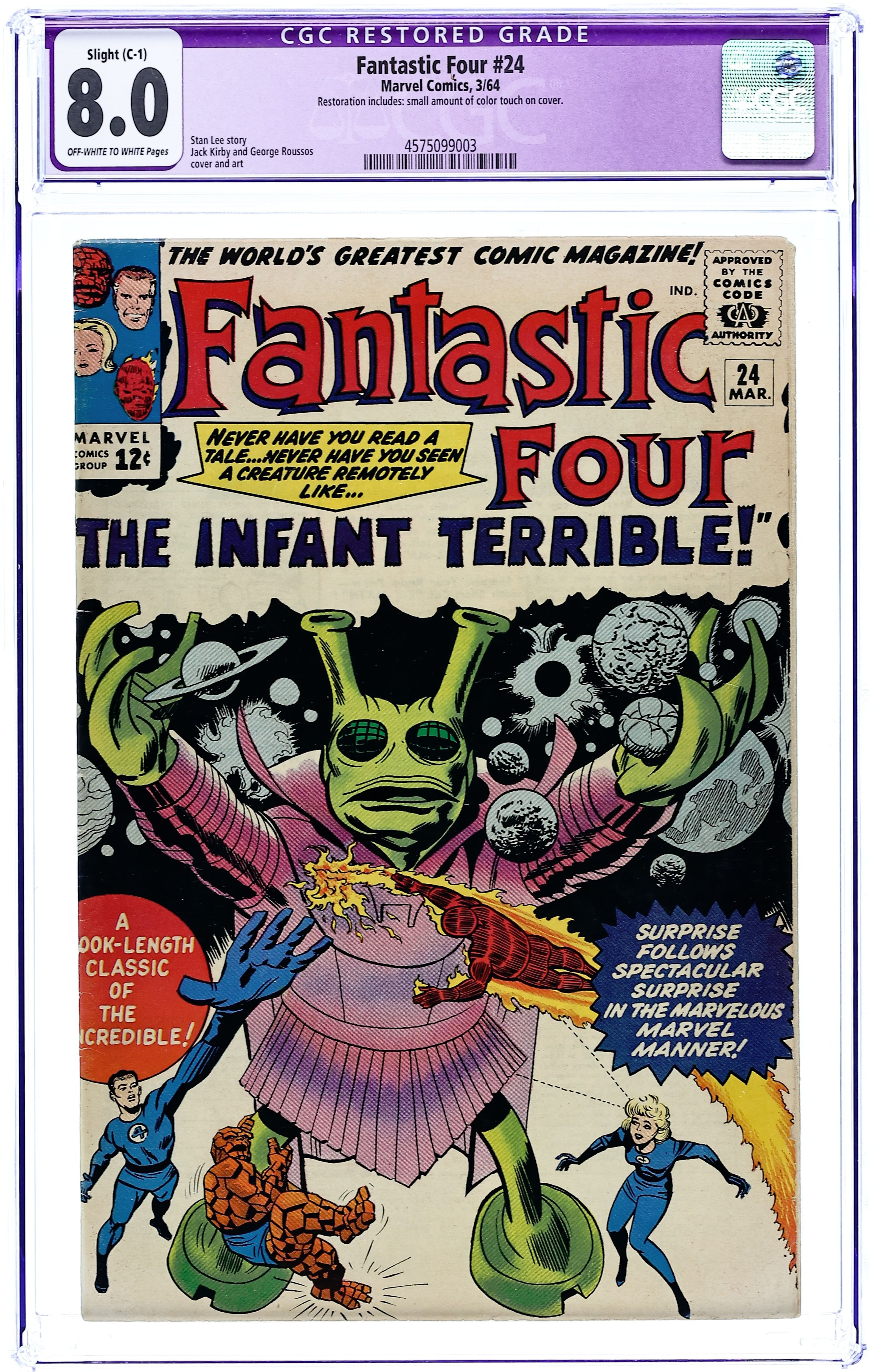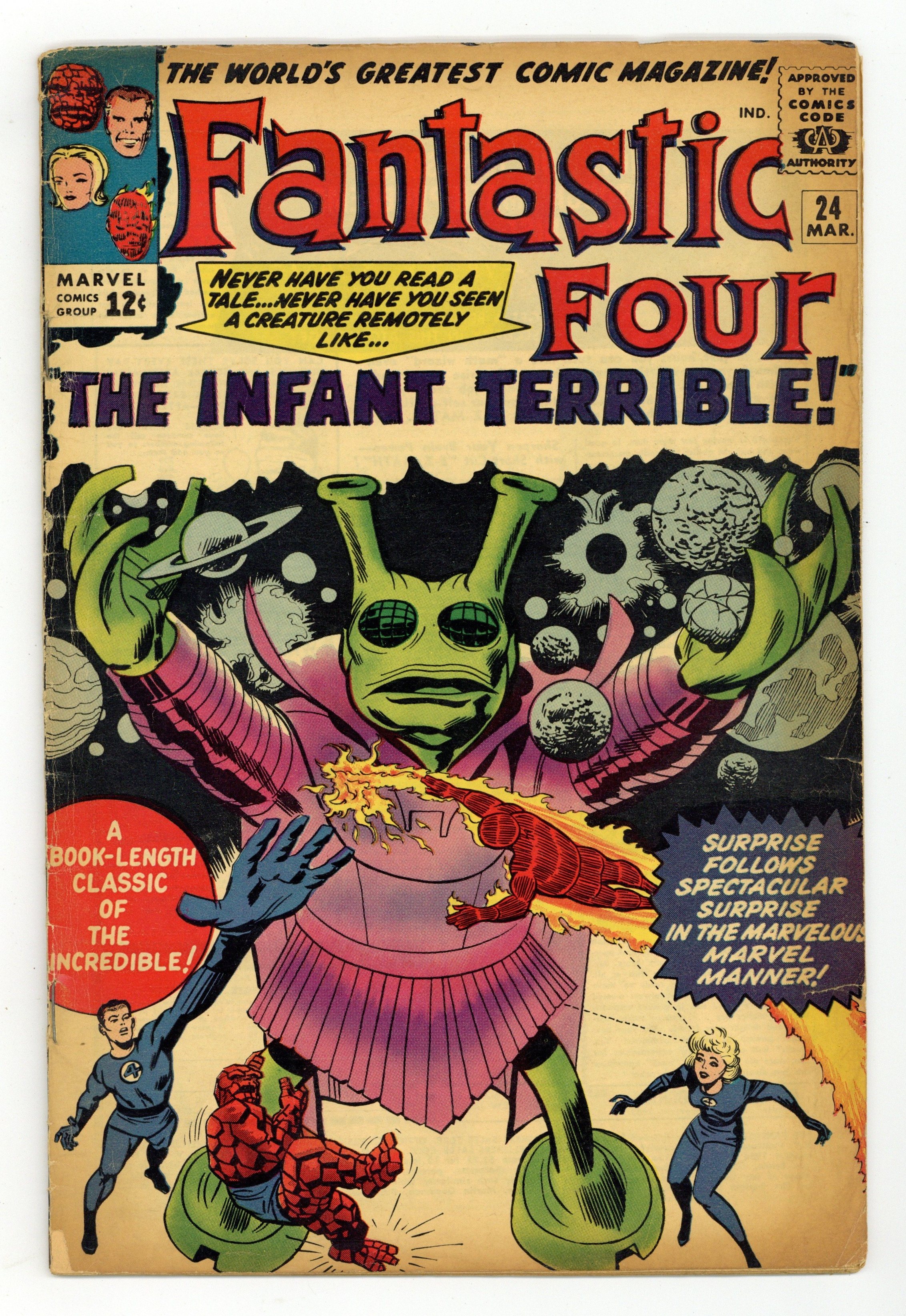 Cover pencils by Jack Kirby, inks by George Roussos. The Infant Terrible!, script by Stan Lee, pencils by Jack Kirby, inks by George Roussos [as Geo. Bell]; An extra-terrestrial wreaks havoc in New York City, until Reed deduces that it is an infant and summons its parents. Letter to the editor from writer Don Glut. 36 pgs. $0.12. Cover price $0.12.