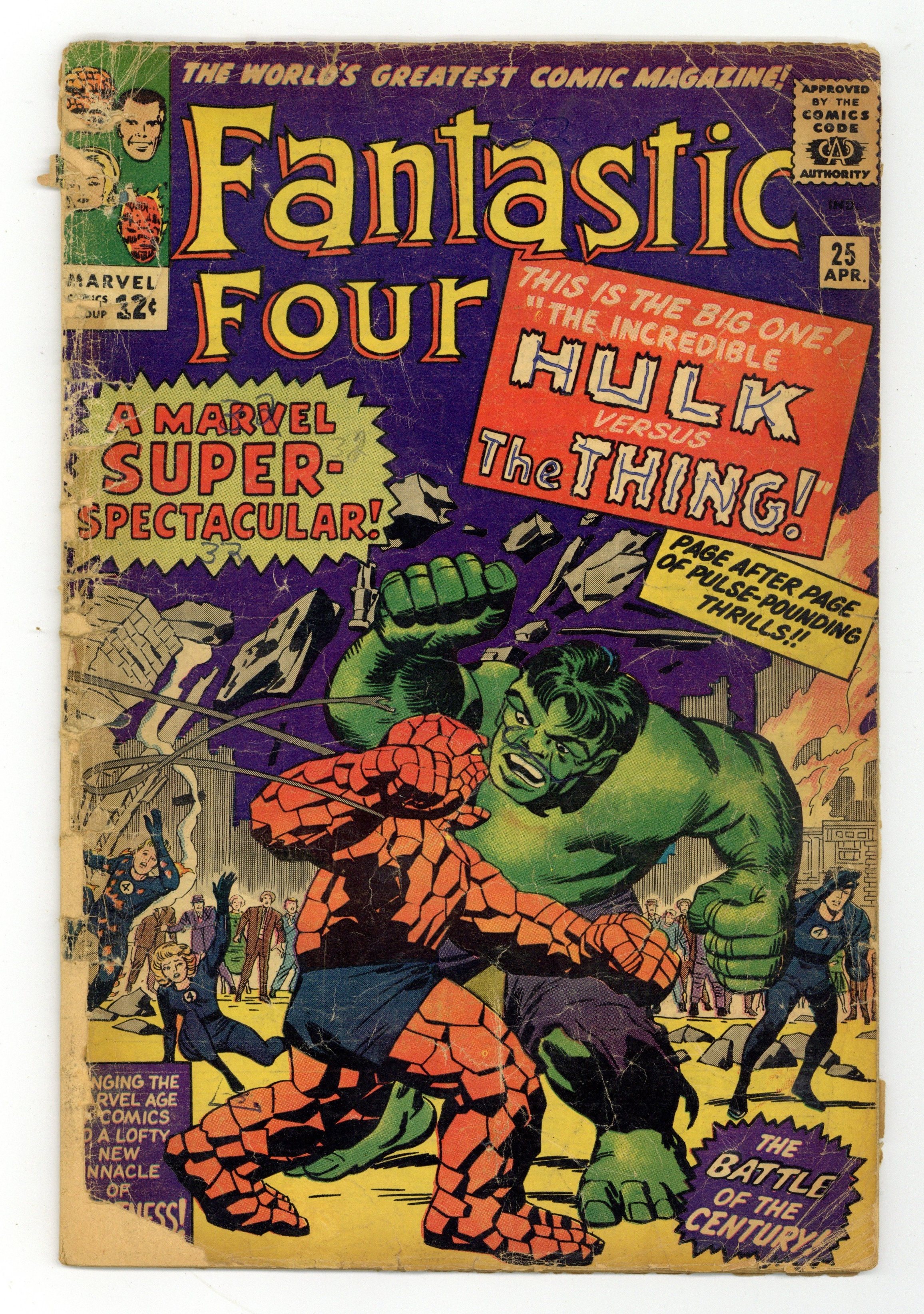 Cover pencils by Jack Kirby, inks by George Roussos. The Hulk Vs. The Thing, script by Stan Lee, pencils by Jack Kirby, inks by George Roussos [as G. Bell]; Hulk understands that Rick Jones has deserted him for the Avengers; He comes back to New York to get his revenge on the Avengers but the Fantastic Four are there to stop him; And the Thing is the only one with a chance to defeat him. Third Avengers cross-over; second Silver Age Captain America appearance. 36 pgs. $0.12. Cover price $0.12.