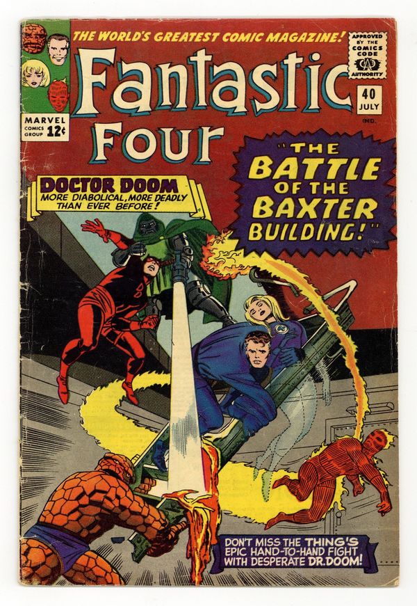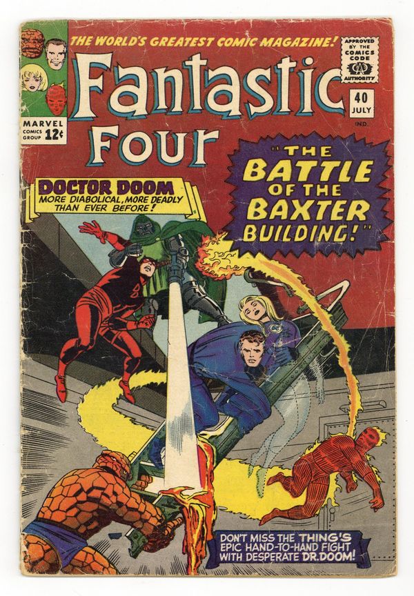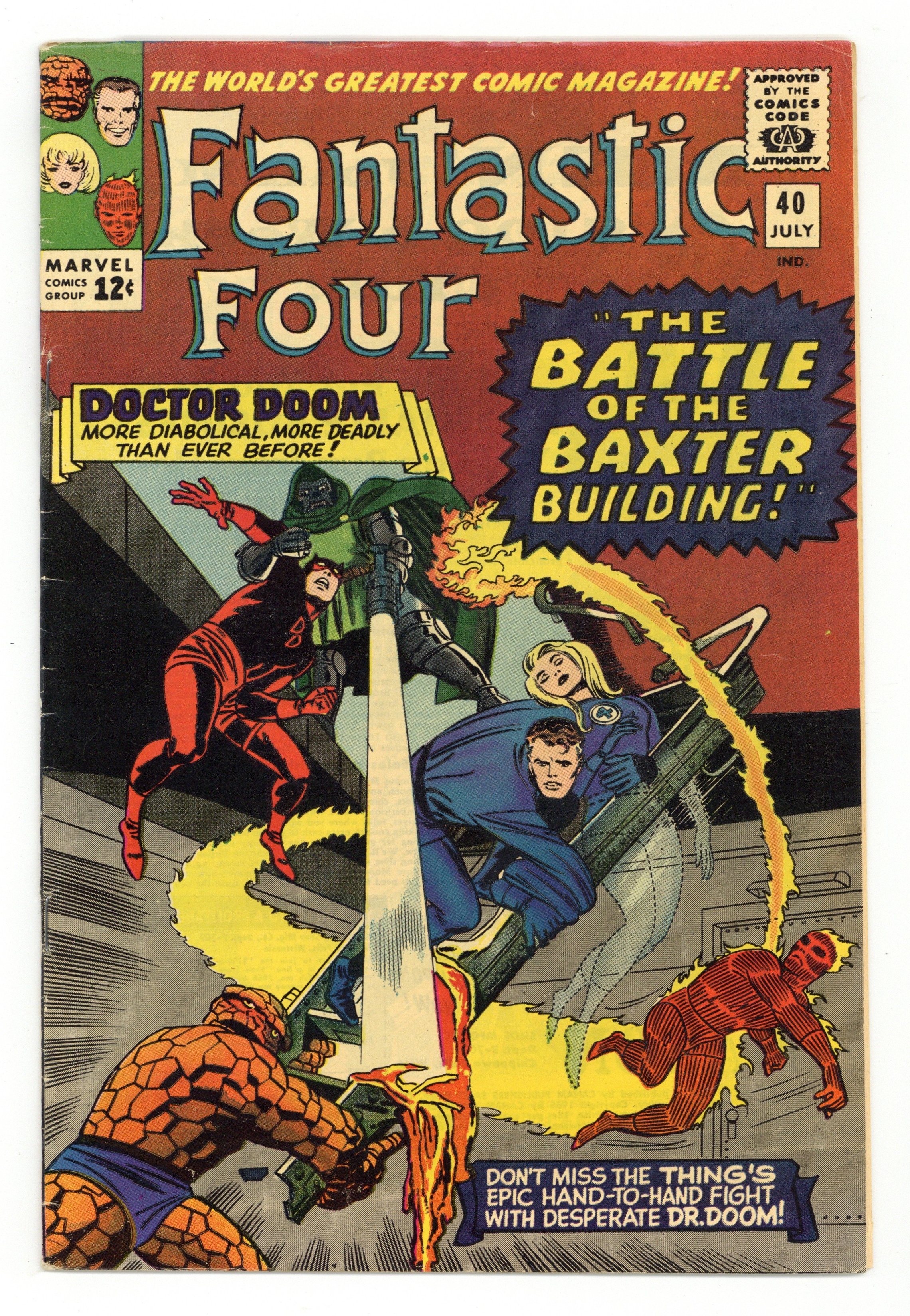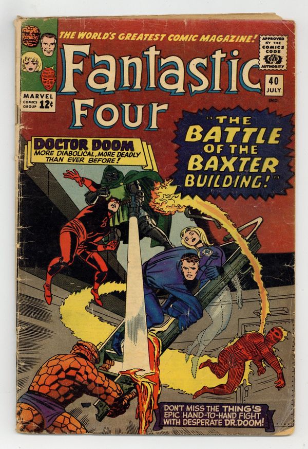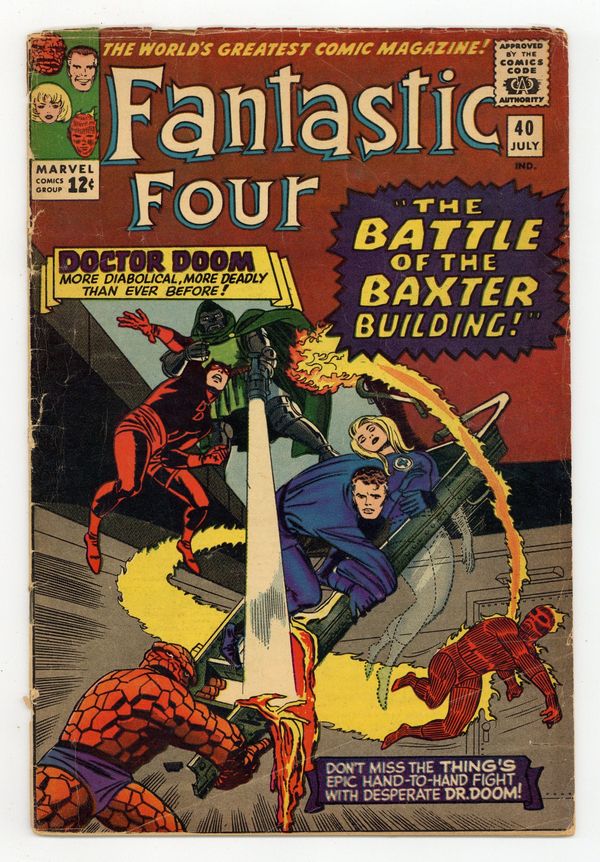 Cover pencils by Jack Kirby, inks by Frank Giacoia. The Battle of the Baxter Building, script by Stan Lee, pencils by Jack Kirby, inks by Vince Colletta; Dr. Doom battles the FF and Daredevil; Reed restores the FF's powers. 36 pgs. $0.12. Cover price $0.12.
