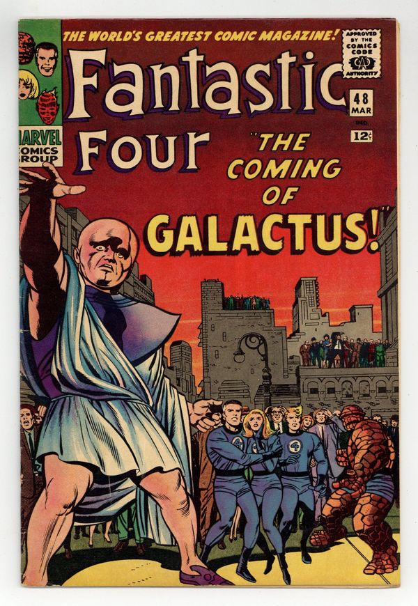 Cover pencils by Jack Kirby, inks by Joe Sinnott. First appearance of Galactus and the Silver Surfer in one of the most famous stories of the Silver Age, The Coming of Galactus!, script by Stan Lee, pencils by Jack Kirby, inks by Joe Sinnott; Black Bolt and the Fantastic Four put an end to Maximus's plan to destroy all the humans; Once the Fantastic Four return to New York the Watcher tells them of the coming danger of Galactus. Letter to the editor from comics writer Don McGregor. 36 pages, full color. Cover price $0.12.