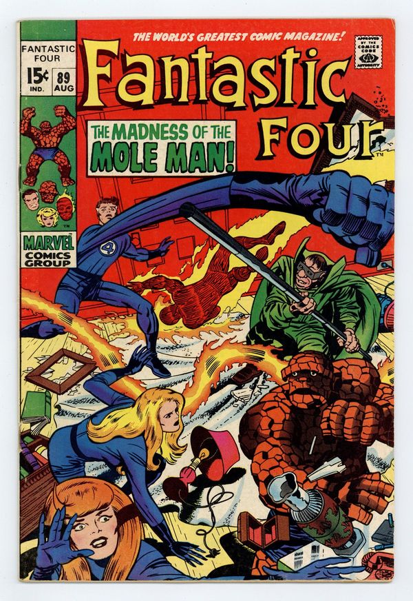 "The Madness of the Mole Man!" Script by Stan Lee. Pencils by Jack Kirby. Inks by Joe Sinnott. Cover by Jack Kirby and Joe Sinnott. The Fantastic Four are blind! And in for the fight of their lives against the Mole Man! The subterranean super-villain corners the FF in his high-tech house and begins picking them off one by one! How can the heroes fight back without their sight? Simple…just listen with their ears! By focusing on the Mole Man's voice; Reed, Ben, and Sue lash out at their long-time foe! When the Invisible Girl breaks through and lands a shot, an opportunity arises for the Human Torch to end the battle! Can Johnny Storm turn up the heat on the Mole Man and bring down the house? Cameo appearance by the Slaver Skrull. First 15¢ issue. 33 pages Cover price $0.15.