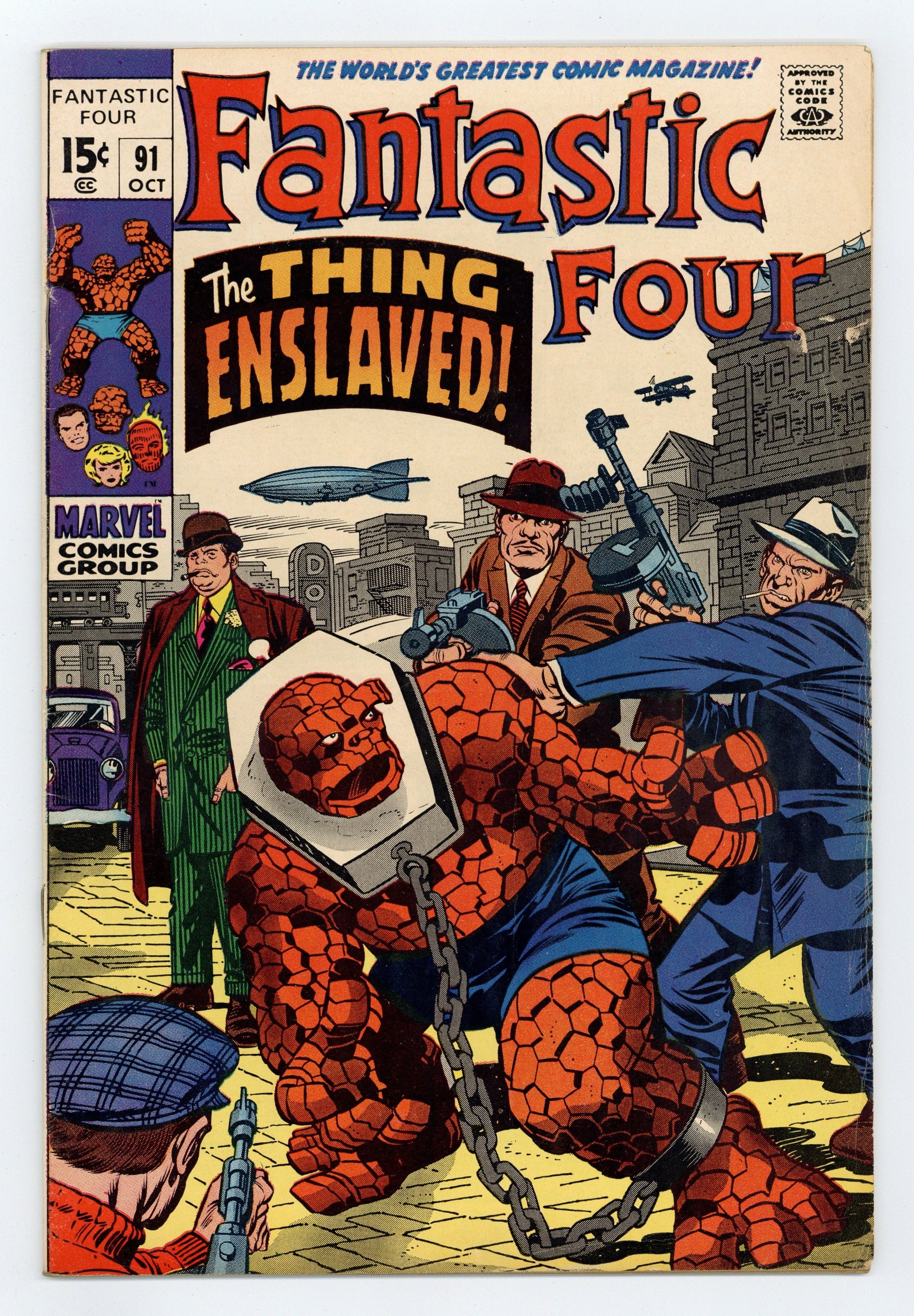 "The Thing Enslaved!" Part 2 of 4. Script by Stan Lee. Pencils by Jack Kirby. Inks by Joe Sinnott. Cover by Jack Kirby and Joe Sinnott. Millions of miles from Earth, Ben Grimm is a prisoner of the Skrulls! What diabolical destiny do the Skrulls have planned for Aunt Petunia's nephew? How about turning the Thing into a modern day Roman gladiator! But before the Thing takes his turn in the ring, he's sold into slavery to a Roaring 20's gangster! What in the world, make that what in the galaxy is going on?! Is the strongest member of the Fantastic Four lost in both time and (outer) space? First appearance of Torgo. Cameo appearances by Alicia Masters, Crystal, and Franklin. (Note: The letters page includes a letter from comics writer Don McGregor.) 36 pages Cover price $0.15.