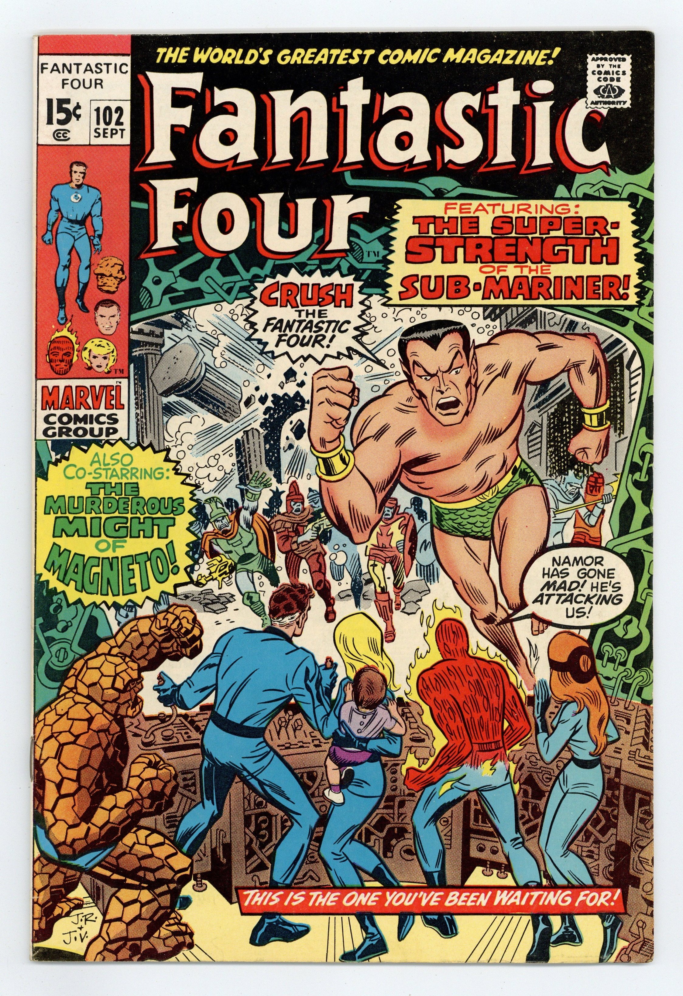 "The Strength of the Sub-Mariner" Part 1 of 3. Guest-starring the Sub-Mariner. Script by Stan Lee. Pencils by Jack Kirby. Inks by Joe Sinnott. Cover by John Romita and John Verpoorten. Prince Namor travels to Antarctica to explore a mysterious subsea shockwave! The Sub-Mariner's investigation leads to the Savage Land and an unconscious man lying on the ground. Who is this gentleman? Readers of the X-Men would know...but unfortunately the Avenging Son does not! Once the Atlanteans take the Master of Magnetism back to Atlantis, he begins to encourage Namor to attack the surface world. Will the Sub-Mariner fall for Magneto's ploy? Regrettably, the Fantastic Four make the choice easy for Namor, when the Thing accidentally fires a missile at Atlantis! Cameo appearance by Franklin. (Notes: Magneto previously appeared in Uncanny X-men 63. This is Magneto's first appearance after the X-Men series went into reprint in the early 1970's. This is also Jack Kirby's final issue as the regular penciler on the Fantastic Four series. Jack Kirby pencils part of issue 108.) 36 pages Cover price $0.15.