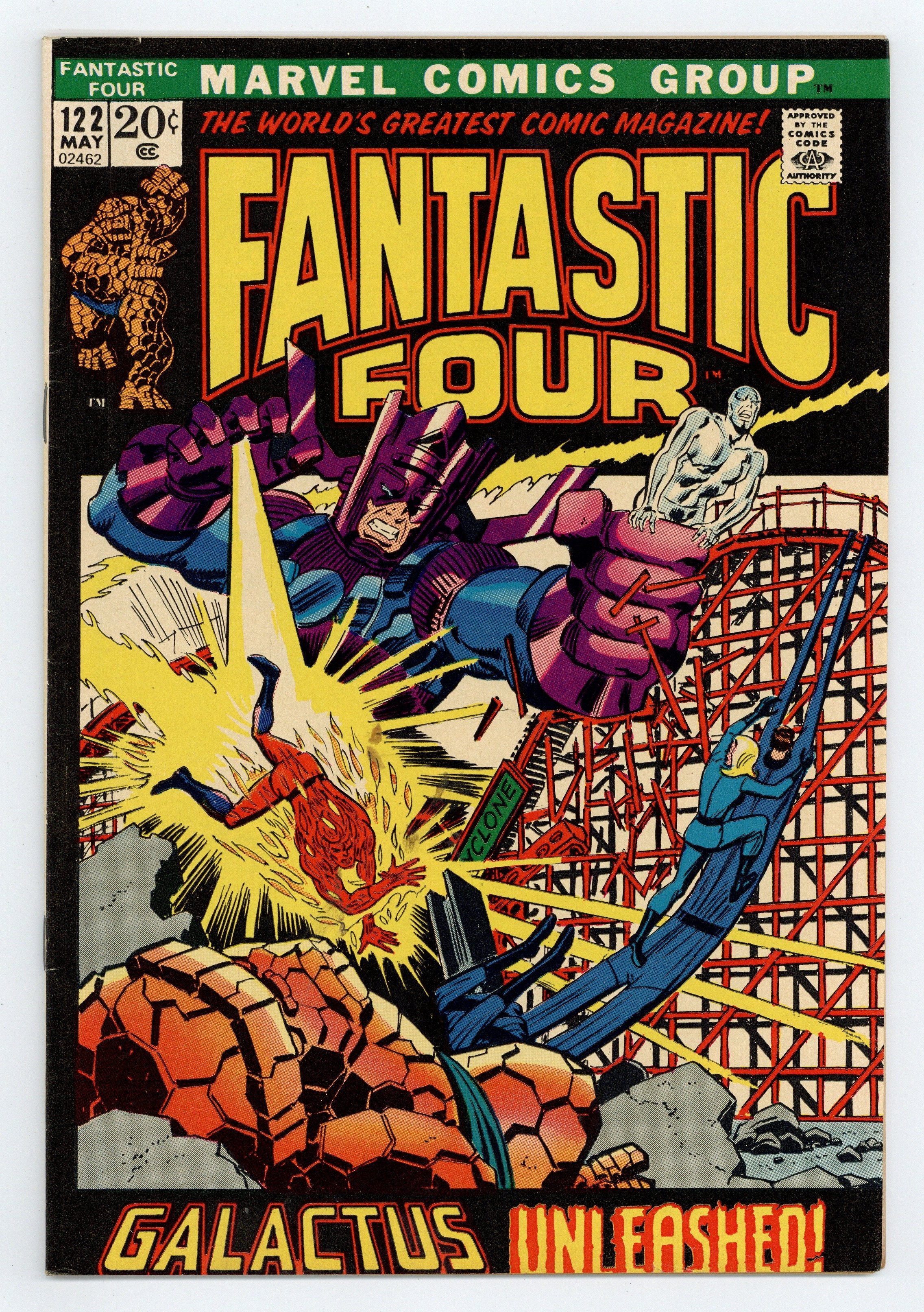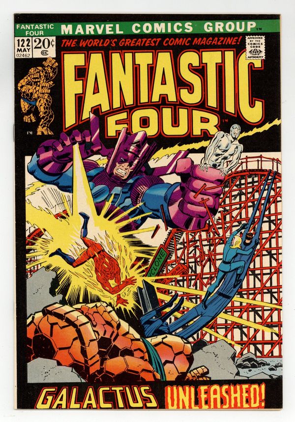 The Silver Surfer and Galactus guest star in "Galactus Unleashed , " Part 3 of 4 . Script by Stan Lee. Pencils by John Buscema and inks by Joe Sinnott with touch-ups by John Verpoorten and John Romita Sr.). Cover by John Buscema and John Romita. Wow! Galactus has come back to Earth! Is this the beginning of the end for the third planet from the sun?!? Maybe not. The Ravager of Worlds is willing to make a deal...he'll spare the Earth if the surfer will become his herald again. After the sky-rider declines, the furious free-for-all begins! The Thing, Human Torch, and Silver Surfer vs. Galactus! Awesome! Meanwhile during the battle, Mr. Fantastic and the Invisible Girl blast off into space to skyjack Galactus' massive starship! (Notes: Galactus previously appeared in Thor 168 and 169. The letters page includes a letter from comics writer Scott Edelman. The letters page also contains a statement of ownership: average print run 460,000; average paid circulation 275,930.) 36 pages Cover price $0.20.