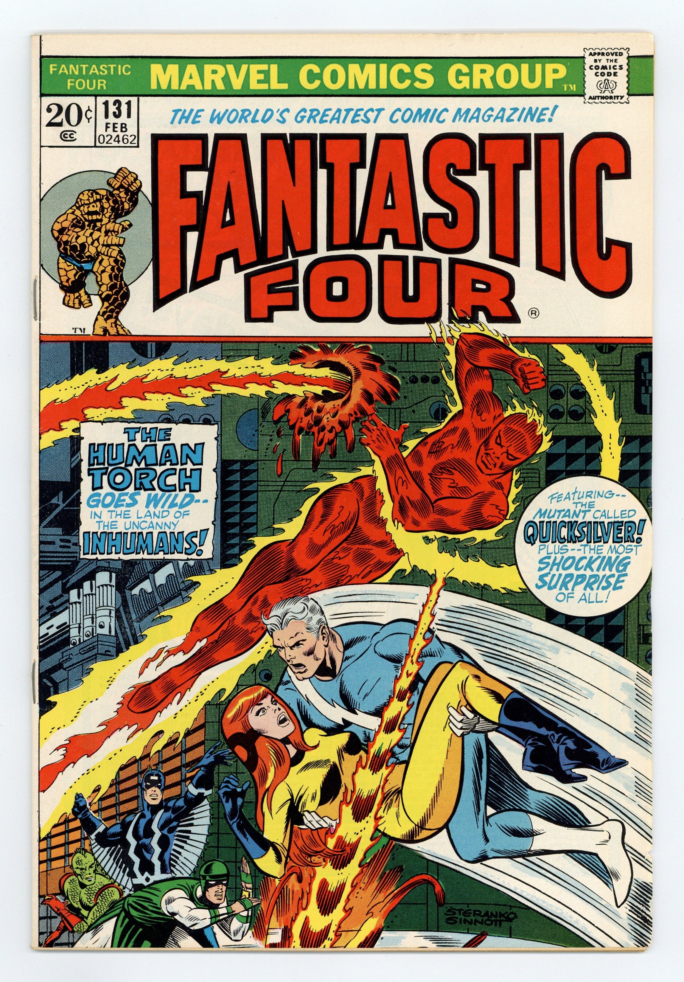 "Revolt in Paradise!" Part 1 of 2. Guest-starring Quicksilver and the Inhumans. Script by Roy Thomas. Pencils by Ross Andru. Inks by Joe Sinnott. Cover by Jim Steranko and Joe Sinnott. A fighting mad Human Torch busts into the Great Refuge's barricaded tower looking for Crystal! Johnny Storm finds her all right...and then finds the biggest shock of his life: Quicksilver! What is the mutant speedster doing in Attilan? And in the company of Crystal? Cooler heads don't prevail, and suddenly it's the Human Torch vs. Quicksilver! But a powerful earthquake rocks Attilan and halts the heroes fight! The Inhumans proceed to round up the usual suspect, Maximus, and press him for answers. But Black Bolt's brother doesn't seem to be the enemy this time...it's the Alpha Primitives and Omega! Flashback cameos by Larry Trask and the Sentinels. (Notes: Roy Thomas' bringing together of Crystal and Pietro was a very significant event in the Marvel Universe. Their relationship would spawn many future storylines among the Avengers, Inhumans, and Fantastic Four. Quicksilver previously appeared in Avengers 104. The letters page contains letters from both comics writer Mike Barr and Charles Dixon.) 36 pages Cover price $0.20.