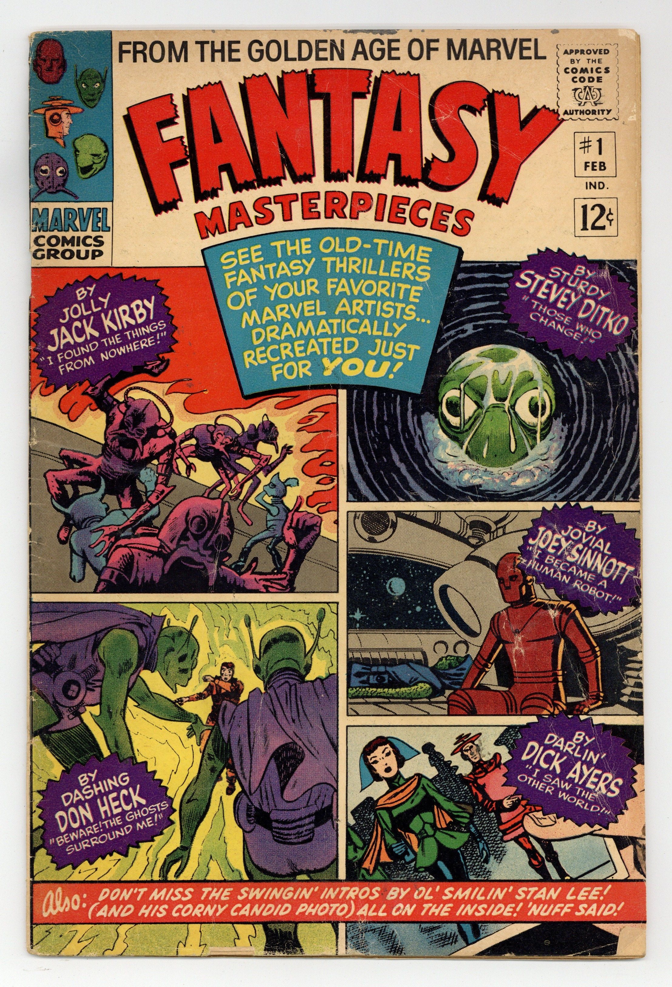 Jack Kirby and Steve Ditko reprints. "Beware!! The Ghosts Surround Me!!" from Strange Tales # 76, art by Don Heck; A fleeing criminal in Transylvania hides in an abandoned house, but aliens from a parallel dimension appear to him; He is relieved to find they cannot hurt him, but instead they phase him into an invisible, immaterial state and leave him there forever. "I Found the Things from Nowhere" from Journey into Mystery # 60, pencils by Jack Kirby, inks by Steve Ditko; Joe Carter tries to fix his TV and tunes into what he thinks is an alien battle. "I Became a Human Robot" from Suspense # 5, art by Joe Sinnott; An alien spy places his mind in a robot sent to Earth, hoping to be taken in for study; He gains access to data on Earth technology, but the scientists turn his robot body off, trapping him. "I Saw the Other World!" from Tales to Astonish # 7, art by Dick Ayers; A man tries to convince a stranger that the camera he found takes pictures of another dimension; The stranger seems skeptical, when a bolt of lightning strikes and the stranger disappears, along with the man's pictures. "Those Who Change" from Amazing Fantasy # 10, script by Stan Lee, art by Steve Ditko; A time travel experiment goes wrong. Photo of Stan Lee. 36 pgs., full color. Cover price $0.12.