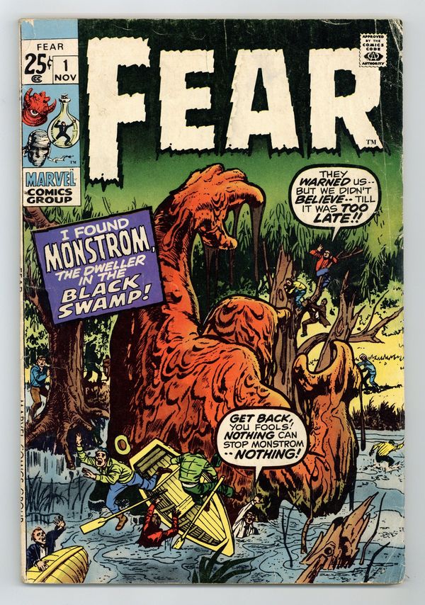 Giant-size issue. All reprints: Cover art by Jack Kirby and Marie Severin (alterations). All reprints: "I Found Monstrom! The Dweller in the Black Swamp!", pencils by Jack Kirby, inks by Dick Ayers; A vacationing family finds a monster in a swamp; The locals drive it back into the swamp with torches, but it was only a shipwrecked alien trying to get help. "I Am the Man Who Will...Destroy Your World!", art by Don Heck; An alien emperor of an immortal race comes to Earth disguised as a human to decide whether or not to order an invasion; He is impressed with the humans' decency and falls in love with a human girl. "I – Am – The – Genie!", pencils by Jack Kirby, inks by Steve Ditko; Criminal Freddy Sykes finds a genie and plans to use its powers for his own benefit. "I Was Face-to-Face With the Forbidden Robot!", art by Don Heck; In the near future, a man reactivates an illegal robot in order to gain recognition for stopping it; He destroys the robot, but realizes that robots are harmless, and instead of cashing in he confesses his plan, and advocates the legalization of robots. "What Was the Strange Power of Simon Drudd!!", pencils by Jack Kirby, inks by Christopher Rule; A scientist selfishly uses a youth serum to gain an advantage over other people, but the serum ages him backwards into non-existence. "Something Lurks Inside!", art by Steve Ditko; A space explorer cannot rid his ship of vicious alien spiders, and is forced to sacrifice himself to save Earth. "Only I Know When the World Will End!!!", art by Don Heck; A derelict claims to be from another world and says that another planet will collide with Earth within days, but he is believed mad. "I Fought the Man Who Couldn't Be Killed," art by Sol Brodsky; A criminal escapes from prison in 1969 after 10 years and robs a warehouse; He is found by a police officer with superhuman powers. "Mummex---King of the Mummies!", art by Don Heck; An archaeologist finds a giant mummy in the Egyptian desert; It rises and searches the tombs and museums of the area, examining several mummies before returning into the desert. 68 pgs., full color. Cover price $0.25.