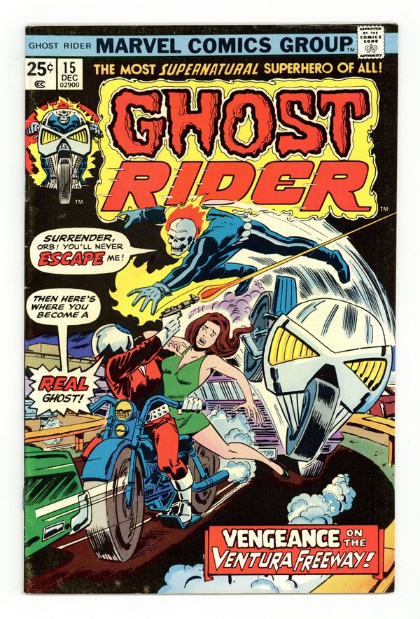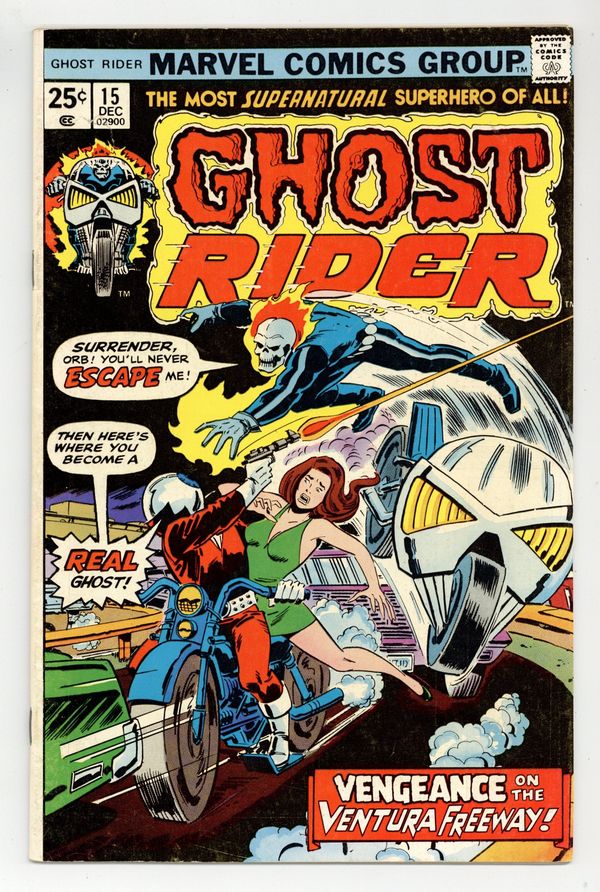 Part 2 of 2 - "Vengeance of the Ventura Freeway!" Guest-starring Stunt Master and from the pages of Daredevil, Karen Page. Story by Tony Isabella. Art by Bob Brown and Don Heck. Cover by Sal Buscema and Frank Giacoia. Can Ghost Rider stop the machinations of the Uncanny Orb when his foe has the beautiful Karen Page under his thrall? 32 pages, FC. Cover price $0.25.