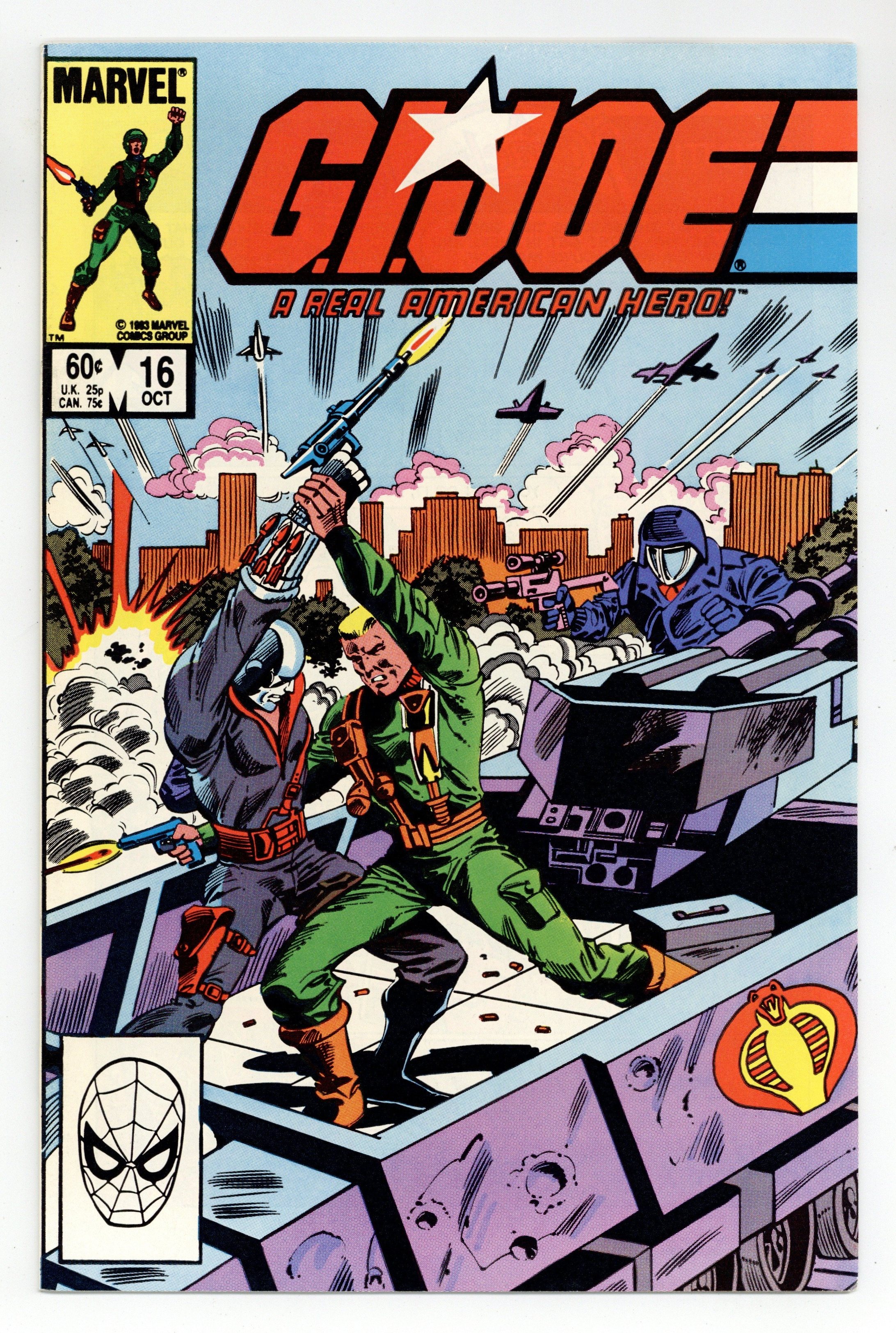 First printing. Direct Edition. "Night Attack!" Written by Larry Hama. Art by Mike Vosburg and Jon D'agostino. In Washington, D.C., Hawk goes hand to hand with Cobra Commander and Destro on the back of a rolling HISS tank and Major Bludd leaves The Baroness to die in an exploding tank. 1st appearance of Cover Girl and Trip-Wire. 1st time all of Cobra big wigs seen together. Introduction of Joes Wolverine tank. 32 pages, FC. Cover price $0.60.