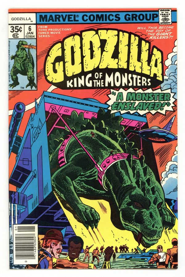 "A Monster Enslaved!" Part 1 of 3. Story by Doug Moench. Art by Herb Trimpe. Has S.H.I.E.LD., with help from Stark International (a company owned by Tony Stark a.k.a. Iron Man), finally devised a way to take down the reptilian titan known as Godzilla. Plus, what is "Mr. Project," and what does it mean for Godzilla. Cover price $0.35.