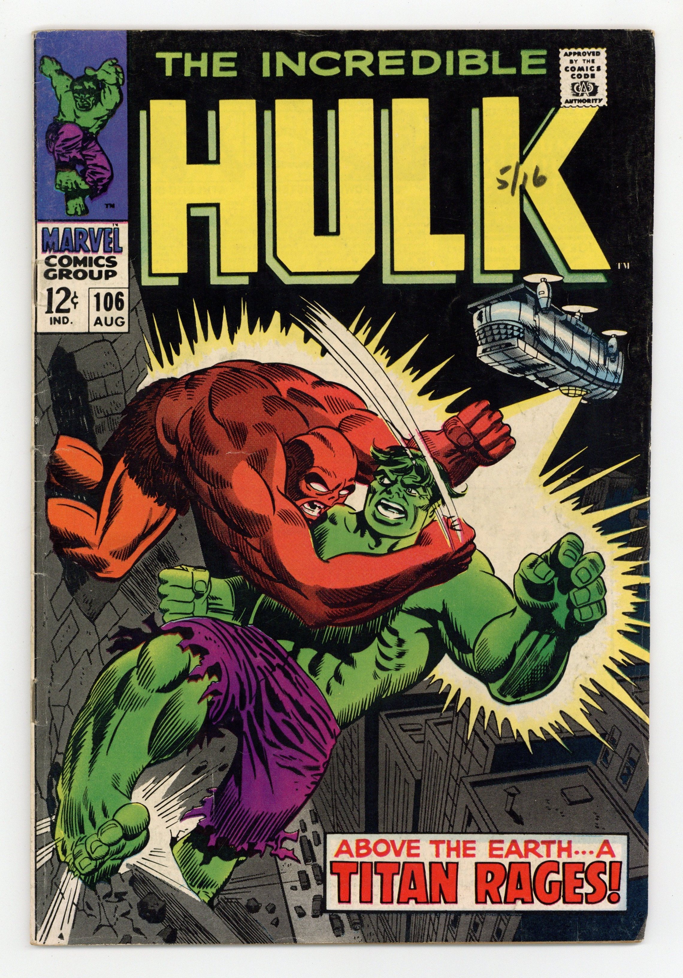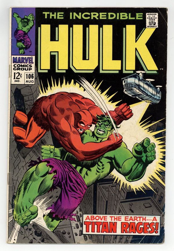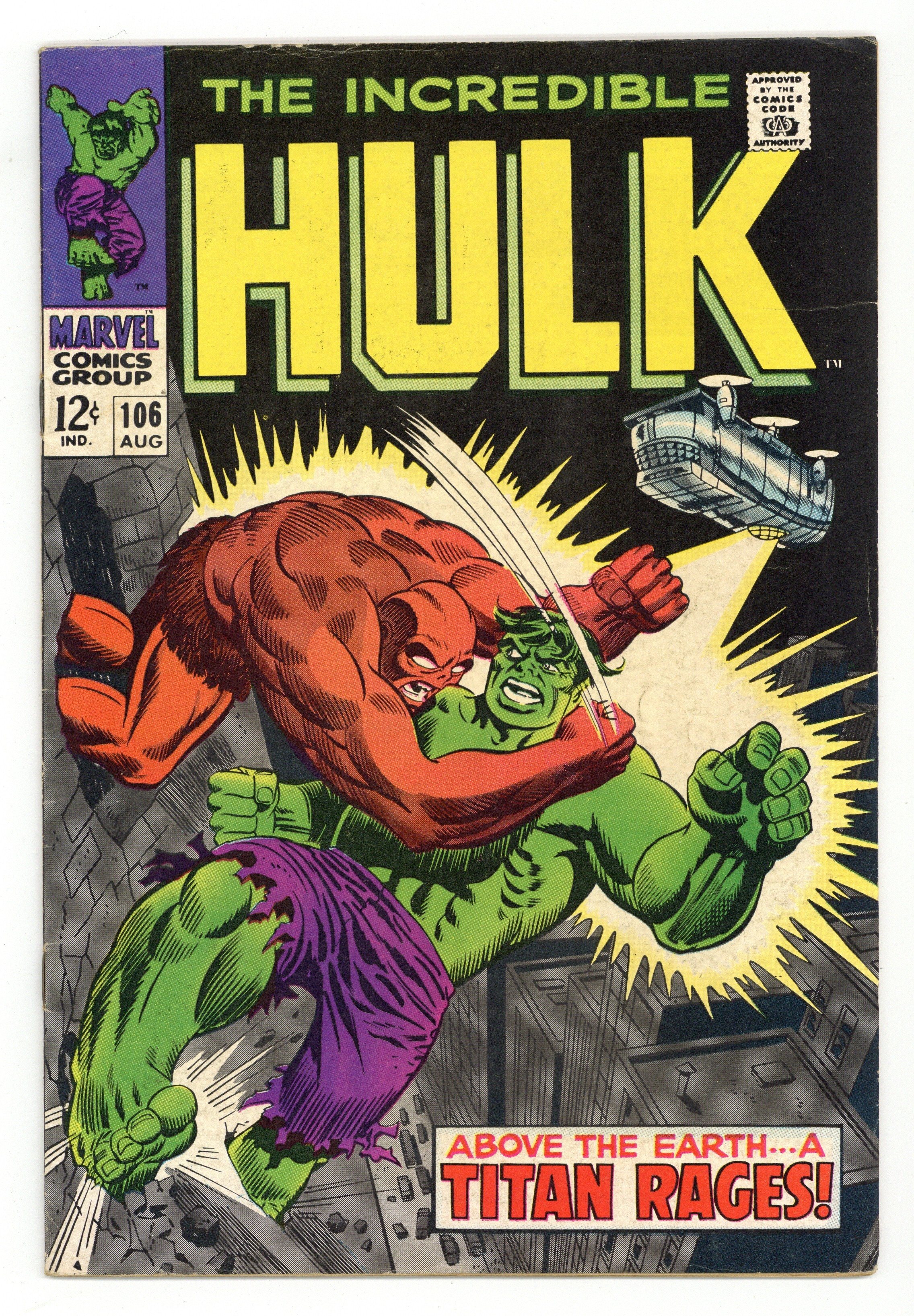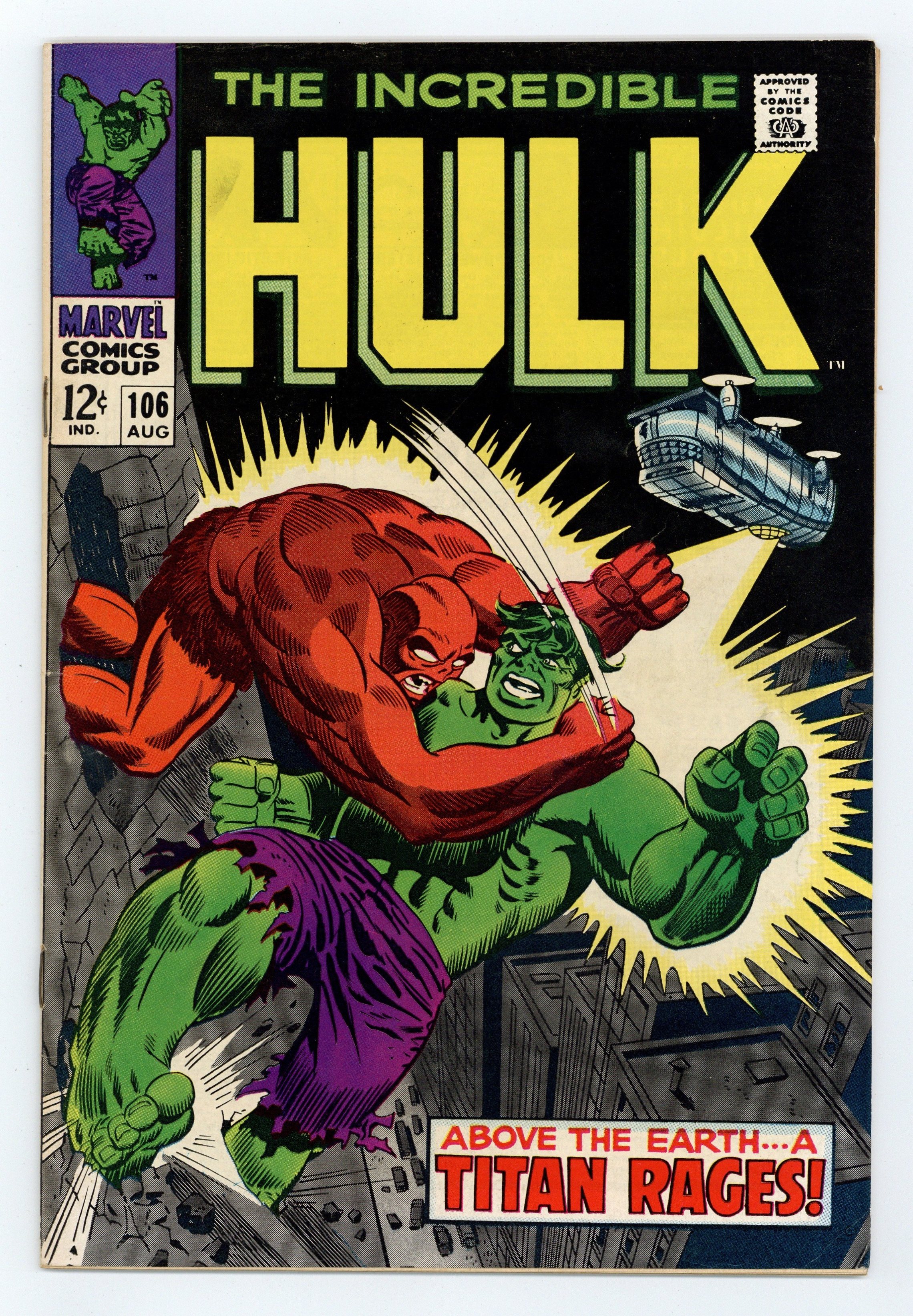 Tags: Marvel Legacy Numbering: Hulk (part 106), Hulk$27.50Cover pencils by Marie Severin, inks by Frank Giacoia. Above the Earth -- a Titan Rages!, script by Archie Goodwin (Pgs. 1-10) and Roy Thomas (Pgs.11-20), pencils by Marie Severin (layouts) and Herb Trimpe, inks by George Tuska; Banner once again becomes the Hulk as the battle with the Missing Link continues; Nick Fury and SHIELD move in to help out Ross in capturing the two monsters; During the fight, what everyone thinks is the helicarrier beams the tusseling titans aboard but it actually turns out to be a Russian ship manned by Brevlov; The Russians test the Missing Link to find out how to use its power but the Hulk escapes his captivity and causes mayhem; The Hulk makes it back to terra firma just as the Missing Link finally overloads on radiation and explodes; Yuri and his men escape their doomed ship in a smaller saucer and even though the Hulk has just saved a small Russian boy from a burning house, Brevlov is pressured by his men to finish off the monster. House ad for the Spectacular Spider-Man #1, art by John Romita. House ad for Not Brand Echh #9, art by Marie Severin. 36 pgs. $0.12. Cover price $0.12.