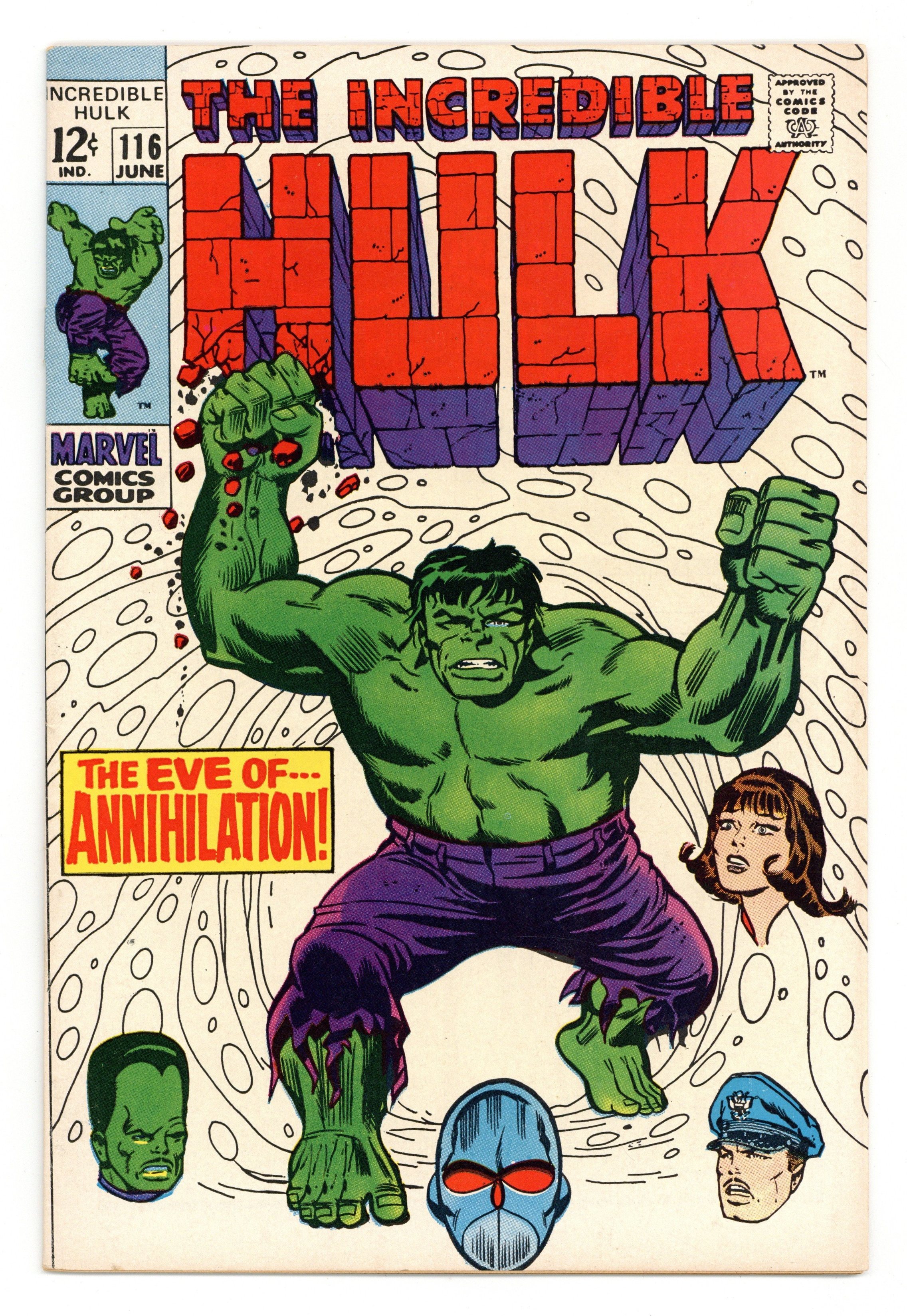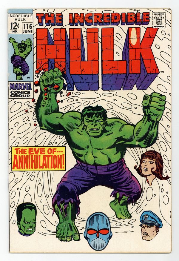 Cover art by Herb Trimpe. The Eve of Annihilation, script by Stan Lee, pencils by Herb Trimpe, inks by Dan Adkins; With the Hulk in an unbreakable plastic prison of the Leader's design, things start to look a little fishy as the Leader moves his Giant Humanoid onto the missile base and begins to take over; Betty hears the Leader soliloquizing to himself about his plans for world domination and she convinces Talbot to try and free the Hulk; Once he escapes, the Hulk has to battle through the Super Humanoid to try and stop the Leader from starting a nuclear war. 36 pgs. $0.12. Cover price $0.12.