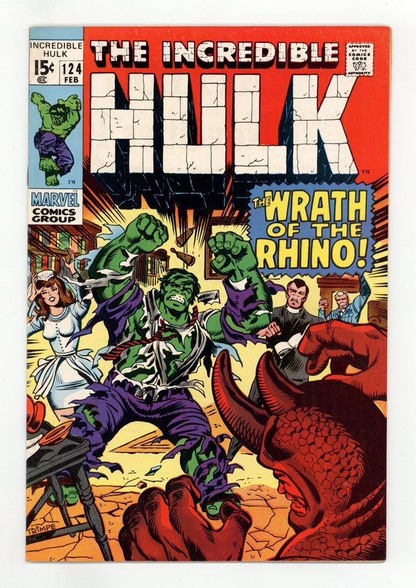 Tags: Marvel Legacy Numbering: Hulk (part 124), Hulk$36.00Cover art by Herb Trimpe. The Rhino Says No!, script by Roy Thomas, art by Herb Trimpe; The Leader augments the Rhino's powers and sends him to bust up the Hulk's wedding day; Bruce and Betty almost get married but during the ceremony in the Ross living room, the Leader zaps Banner with a ray that returns him to mindless Hulk status and he and the Rhino wreck the Ross family home during their battle; The Leader escapes with the Rhino in tow and the Hulk leaps away, totally forgetting about Banner's nuptials. House ad for Sub-Mariner #22 and Sgt. Fury #74. 36 pgs. $0.15. Cover price $0.15.