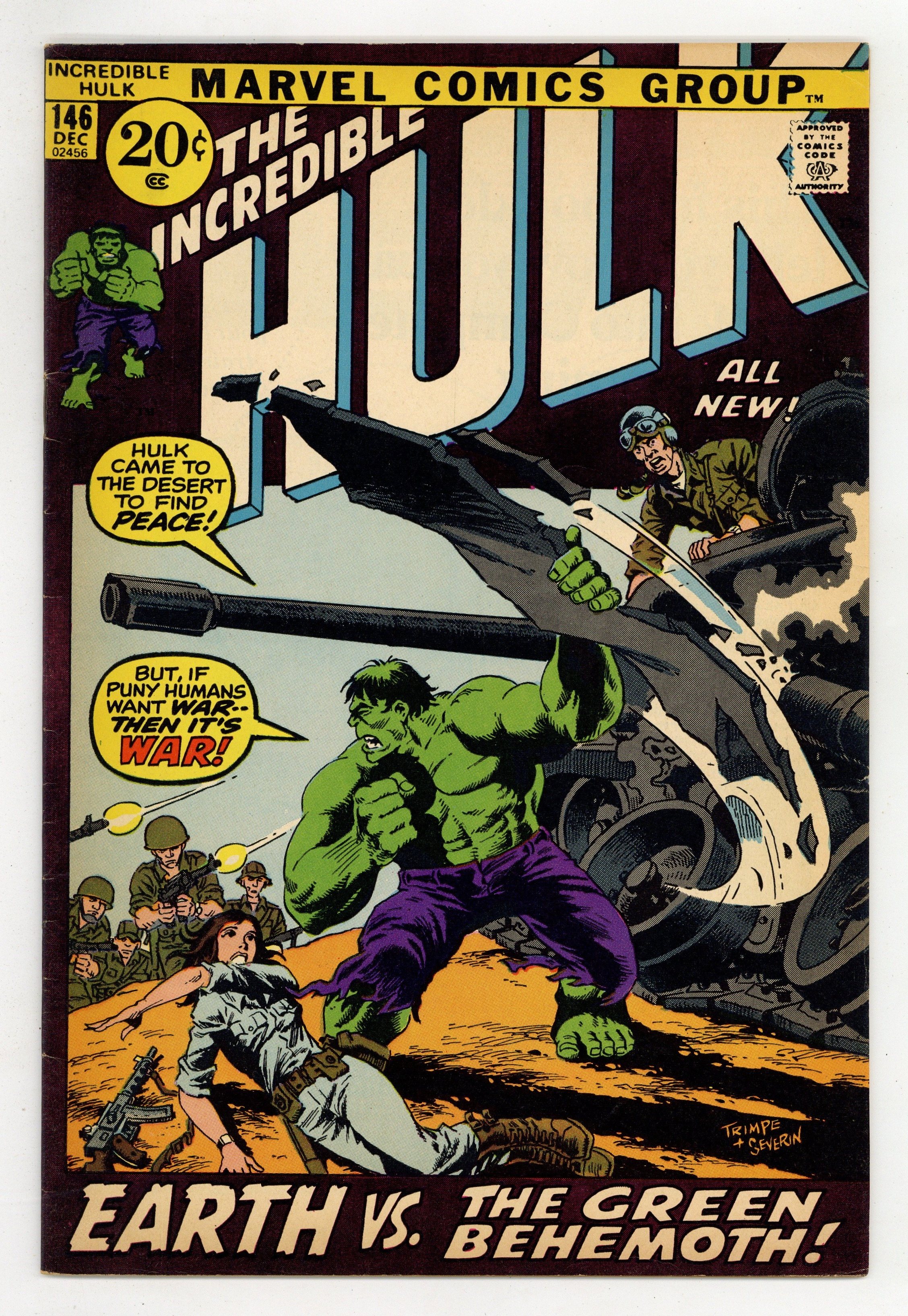 First 20-cent cover price issue. Cover pencils by Herb Trimpe, inks by John Severin. And the Measure of a Man Is...Death!, script by Gerry Conway, pencils by Herb Trimpe, inks by John Severin; Hulk is still wandering around the Sahara desert trying to figure out how to get home when he is attacked by the Israeli army; Faring no better than their American counterparts, the Israelis watch helplessly as Hulk hitches a ride on a plane headed for the U.S.; Meanwhile, as Ross oversees construction of the new Project: Greenskin, Jim comes to him with information about the Leader's sinister plans to replace key people, including the president, with androids. 36 pgs. $0.20. Cover price $0.20.