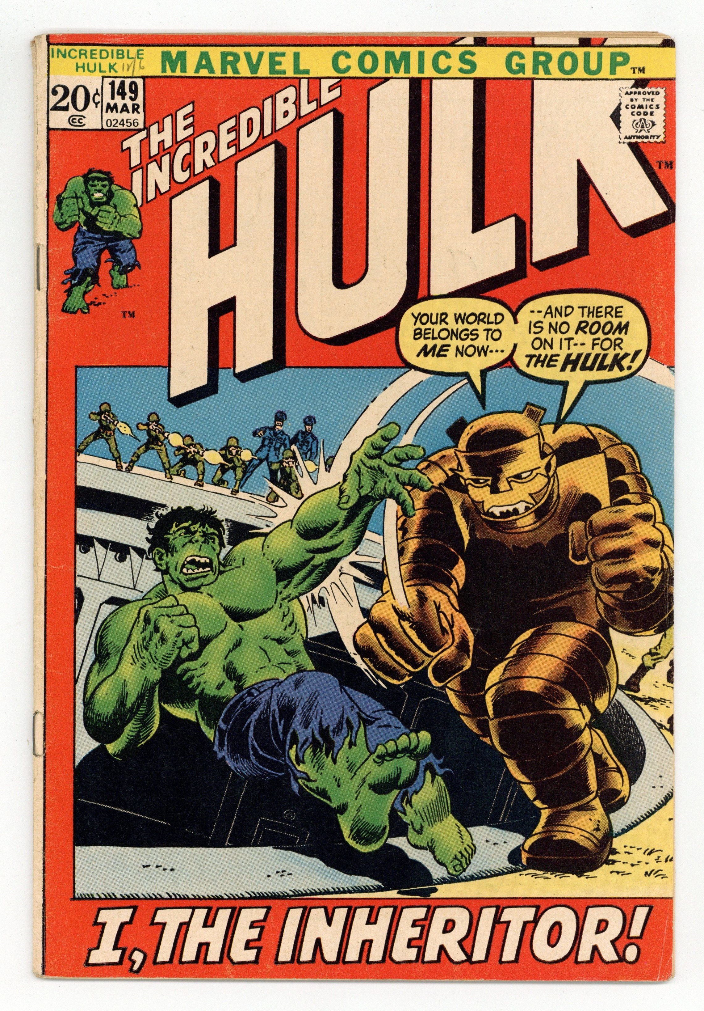 Cover pencils by Herb Trimpe, inks by John Severin. And Who Shall Claim This Earth His Own? The Inheritor, script by Archie Goodwin, pencils by Herb Trimpe, inks by John Severin; Project Greenskin proves to be a success as it is able to contain the Hulk until he once again reverts to Bruce Banner; Bruce uses the state-of-the-art labs housed within the complex to begin work on a new cure for his monstrous condition but his scientific studies are interrupted by a highly evolved cockroach bent on world domination; High Evolutionary cameo; first appearance of The Inheritor. 36 pgs. $0.20. Cover price $0.20.