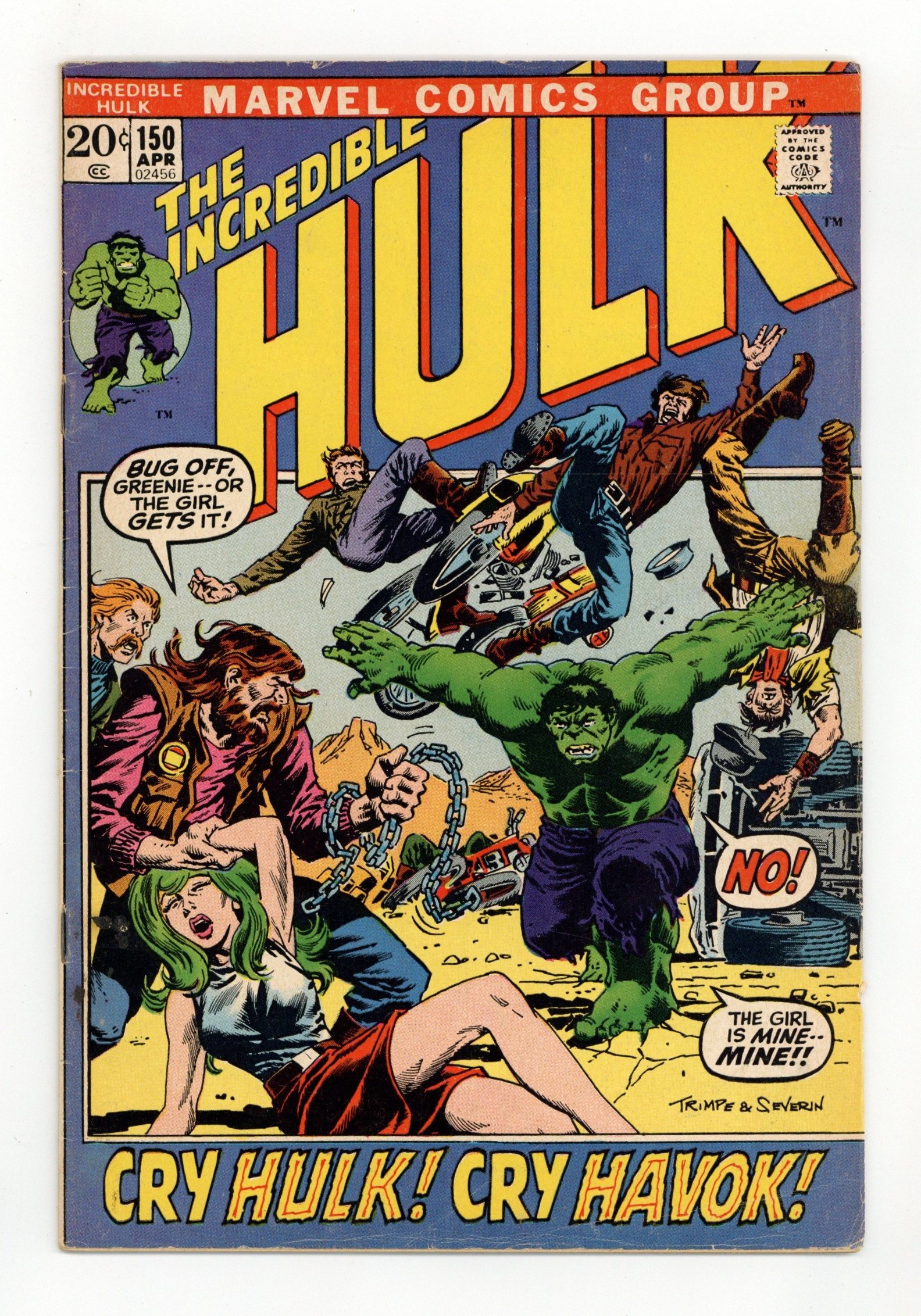 Tags: Marvel Legacy Numbering: Hulk (part 150), Hulk$17.25Cover pencils by Herb Trimpe, inks by John Severin. Cry Hulk, Cry Havok!, script by Archie Goodwin, pencils by Herb Trimpe, inks by John Severin; Hulk escapes Project Greenskin and begins to hunt for Jarella; When he accidentally mistakes Lorna Dane and her green hair for his lost love, this puts him into conflict with her very powerful boyfriend, Havok, who handily beats him; Betty and Glenn find Bruce lying unconscious in the desert and, in a state of delirium, Bruce professes his love for Jarella to the woman he is supposed to be in love with; Iceman (of the X-Men) cameo. 36 pgs. $0.20. Cover price $0.20.
