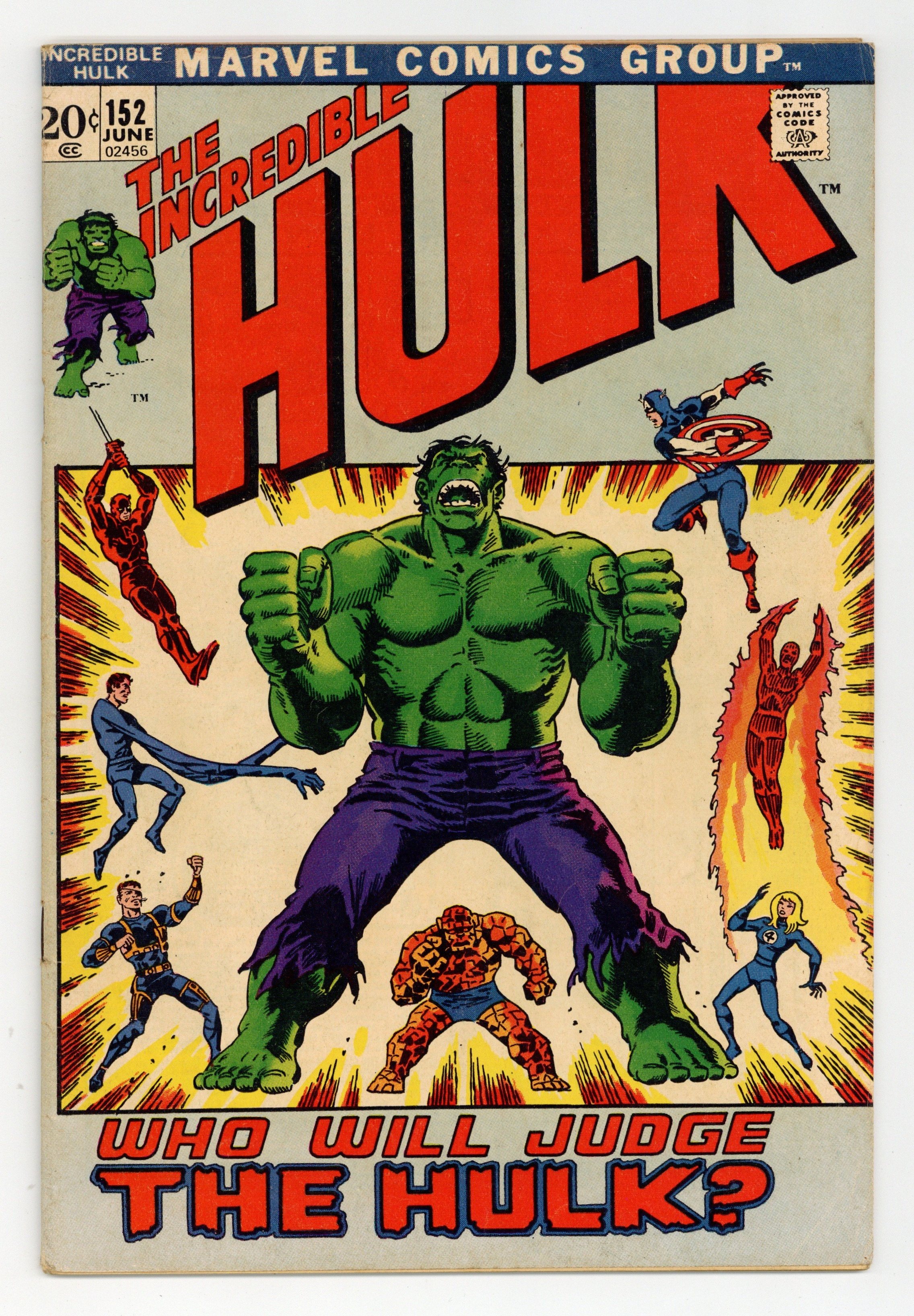 Tags: Marvel Legacy Numbering: Hulk (part 152), Hulk$15.50Cover pencils by Herb Trimpe, inks by John Severin. But Who Will Judge the Hulk?, script by Gary Friedrich and Steve Englehart (uncredited), pencils by Herb Trimpe and Dick Ayers, inks by Frank Giacoia; fter his recent rampage in Washington D.C., the president sends Nick Fury and Cap to help Ross capture the Hulk; They are successful and prepare to transport Bruce to New York to stand trial; During the plane ride, Bruce's lawyer, Matt Murdock, finds him so heavily sedated that he is only able to wallow in guilt and prepare for death; Matt invokes Bruce's civil rights and demands that Ross give him a stimulant so he can talk to his client coherently; Ross reluctantly complies and Bruce quickly turns into the Hulk; Hulk bursts from the plane to find the FF waiting for him on the tarmac of JFK; Guest starring Nick Fury, Captain America, and Matt Murdock (Daredevil), cameos by J. Jonah Jameson, Peter Parker (Spider-Man), the Black Widow, Richard Nixon, and Spiro Agnew. 36 pgs. $0.20. Cover price $0.20.