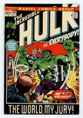 Cover pencils by Herb Trimpe, inks by John Severin. The World, My Jury!, script by Roy Thomas and Gary Friedrich, pencils by Dick Ayers (pages 1-17) and Herb Trimpe (pages 18-21 and Avengers and Iron-Man figures on pages 15-16), inks by John Severin; On a runway at JFK airport, Mr. Fantastic brings the Hulk down with his newly devised Nega-Gamma Gun; The Hulk is placed in heavy restraints and is put on trial for his crimes; After testimony in the case, both pro and con, Matt pulls a stunt out of his lawyer's bag of tricks and quickly proves that the Hulk is too mentally incompetent to stand trial; As the judge tries to figure out how to proceed, Reed shows up with his special gun and claims it will change the Hulk into Bruce Banner for good; Instead, it provides the Hulk with the strength to break free and escape. Letter from comics writer Mike W. Barr. 36 pgs. $0.20. Cover price $0.20.
