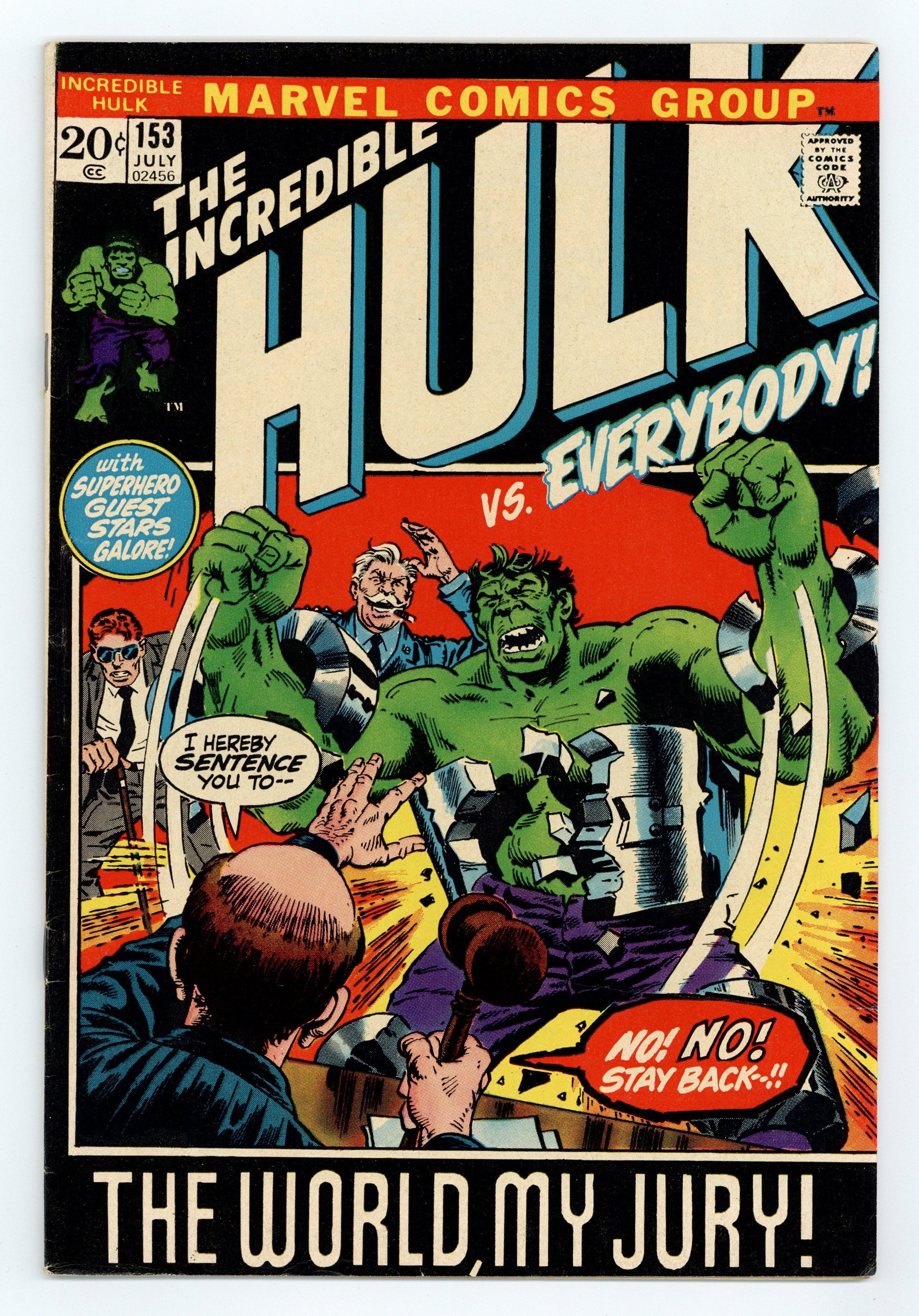 Tags: Marvel Legacy Numbering: Hulk (part 153), Hulk$23.50Cover pencils by Herb Trimpe, inks by John Severin. The World, My Jury!, script by Roy Thomas and Gary Friedrich, pencils by Dick Ayers (pages 1-17) and Herb Trimpe (pages 18-21 and Avengers and Iron-Man figures on pages 15-16), inks by John Severin; On a runway at JFK airport, Mr. Fantastic brings the Hulk down with his newly devised Nega-Gamma Gun; The Hulk is placed in heavy restraints and is put on trial for his crimes; After testimony in the case, both pro and con, Matt pulls a stunt out of his lawyer's bag of tricks and quickly proves that the Hulk is too mentally incompetent to stand trial; As the judge tries to figure out how to proceed, Reed shows up with his special gun and claims it will change the Hulk into Bruce Banner for good; Instead, it provides the Hulk with the strength to break free and escape. Letter from comics writer Mike W. Barr. 36 pgs. $0.20. Cover price $0.20.