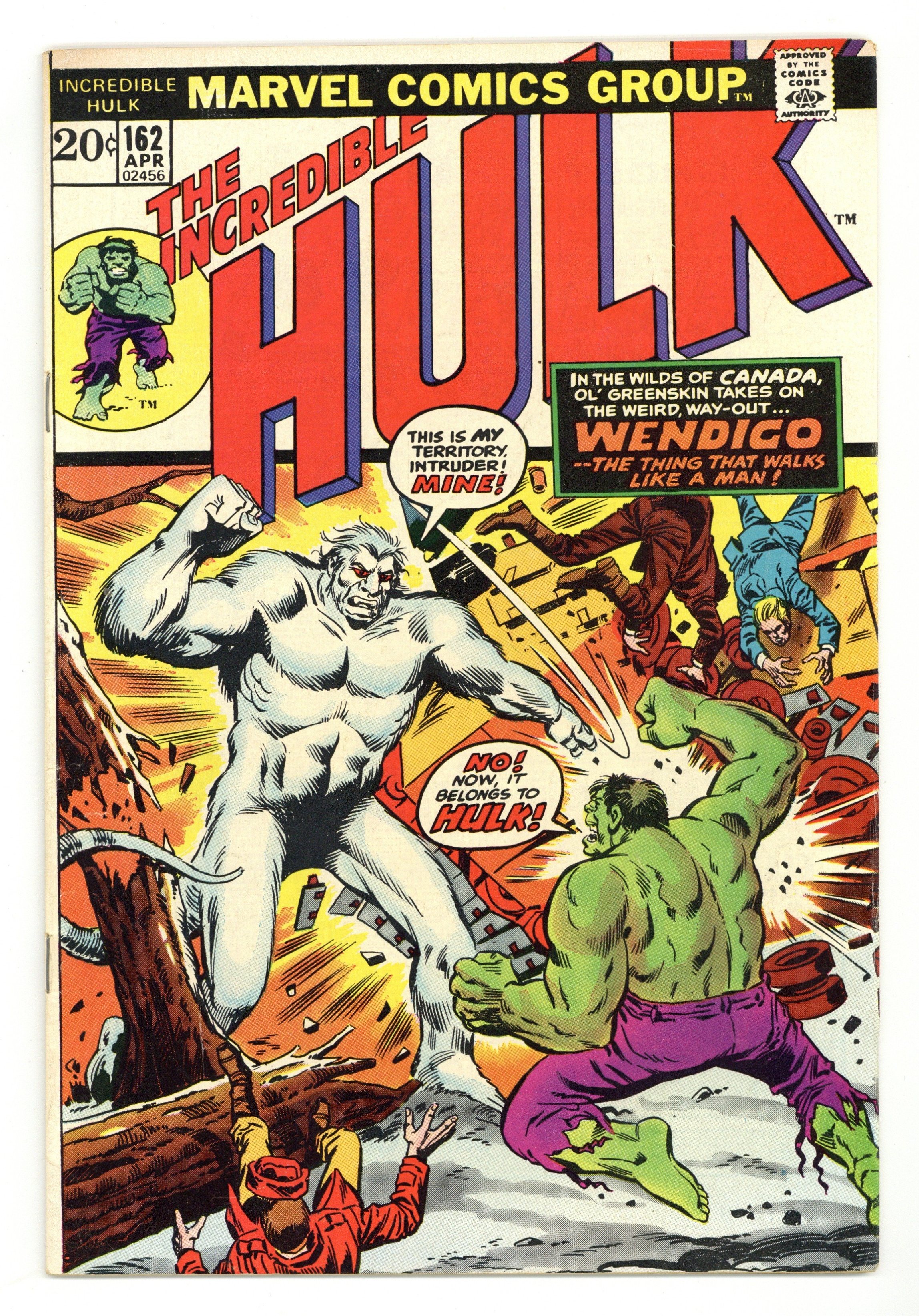 Cover pencils by Herb Trimpe, inks by Sal Trapani. Spawn of the Flesh-Eater!, script by Steve Englehart, pencils by Herb Trimpe, inks by Sal Trapani; Hulk is lost in the Canadian woods when he runs across a distressed young woman who is looking for her missing brother; Hulk rescues a man from the Wendigo whom he thinks to be her brother but Marie tells him that it is her brother's friend, Georges; When Georges regains consciousness, he tells a chilling tale of an act of cannibalism that turned Paul Cartier into the Wendigo. 36 pgs. $0.20. Cover price $0.20.