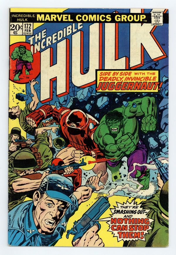 Cover art by Herb Trimpe. And Canst Thou Slay... the Juggernaut?, script by Steve Englehart (plot) and Tony Isabella (script), pencils by Herb Trimpe, inks by Jack Abel; Hulk has been captured and put in a holding cell at Hulkbuster base; As he is quickly dismantling the walls of his prison, Armbruster calls on Peter Corbeau who brings a ray to teleport the Hulk to another dimension; Hulk is blasted away but the Hulkbusters find themselves facing the Juggernaut in his place; When they try to use the ray again, the Hulk returns as well and the two powerhouses quickly bust out and get away; Hulk quickly finds he does not like his new ally and the two battle; The X-Men show up to capture Juggernaut but allow the Hulk to escape. Appearances by the X-Men (Professor X, Cyclops, and Marvel Girl in a crossover with Avengers 111), plus cameos by Doctor Strange, the Angel, the Beast, and Iceman. 36 pgs. $0.20. Cover price $0.20.