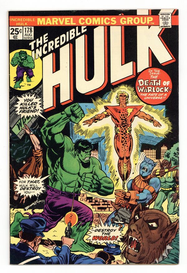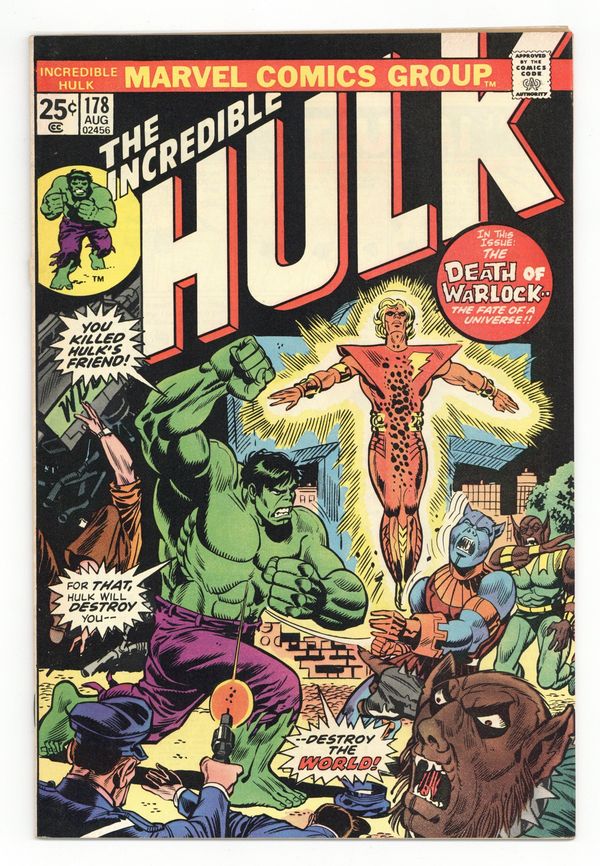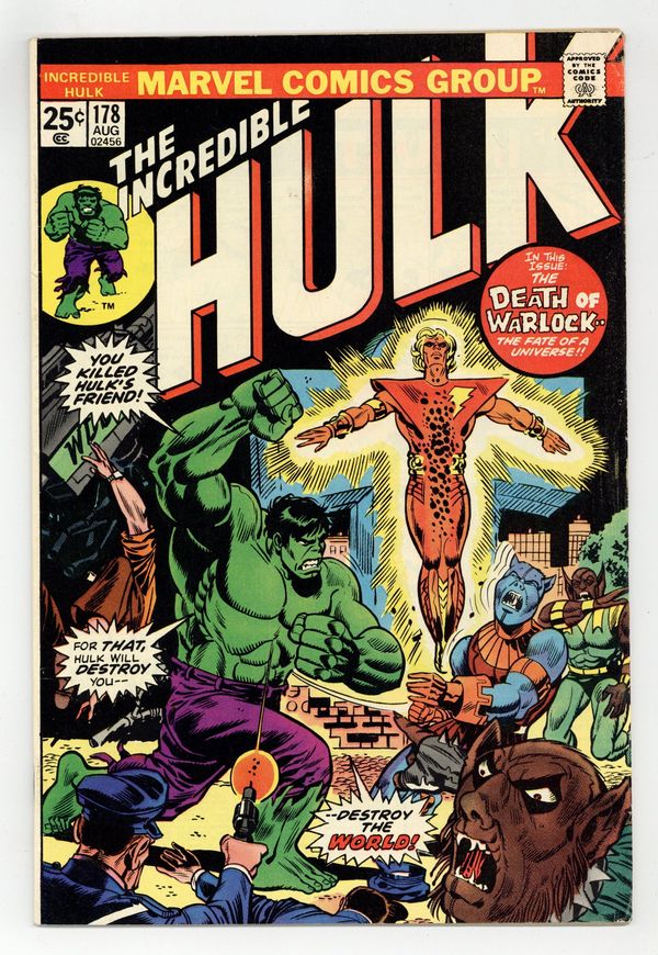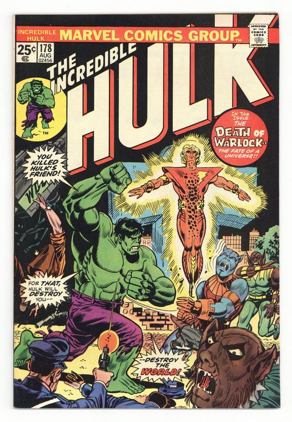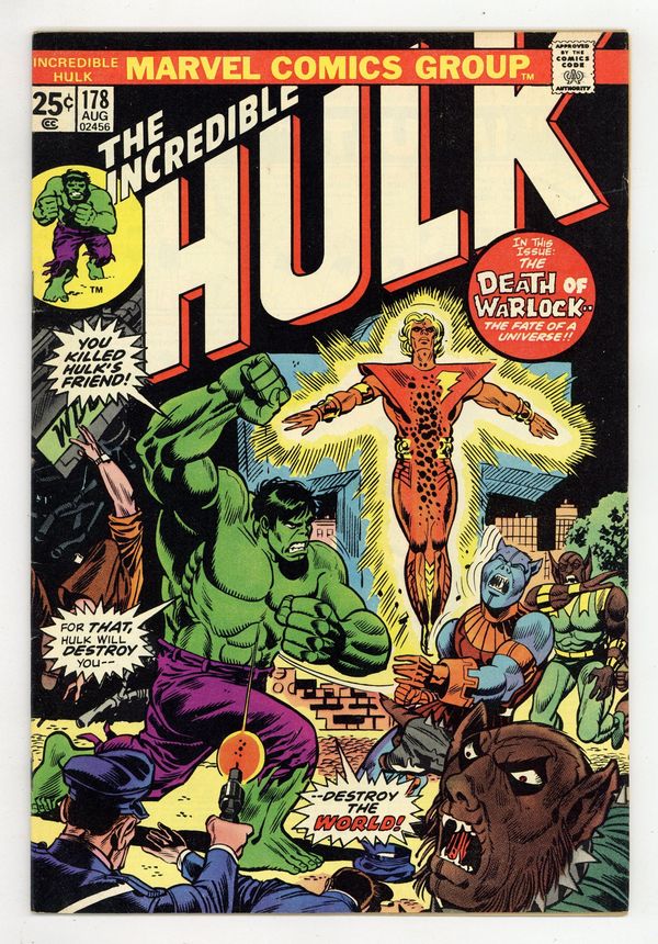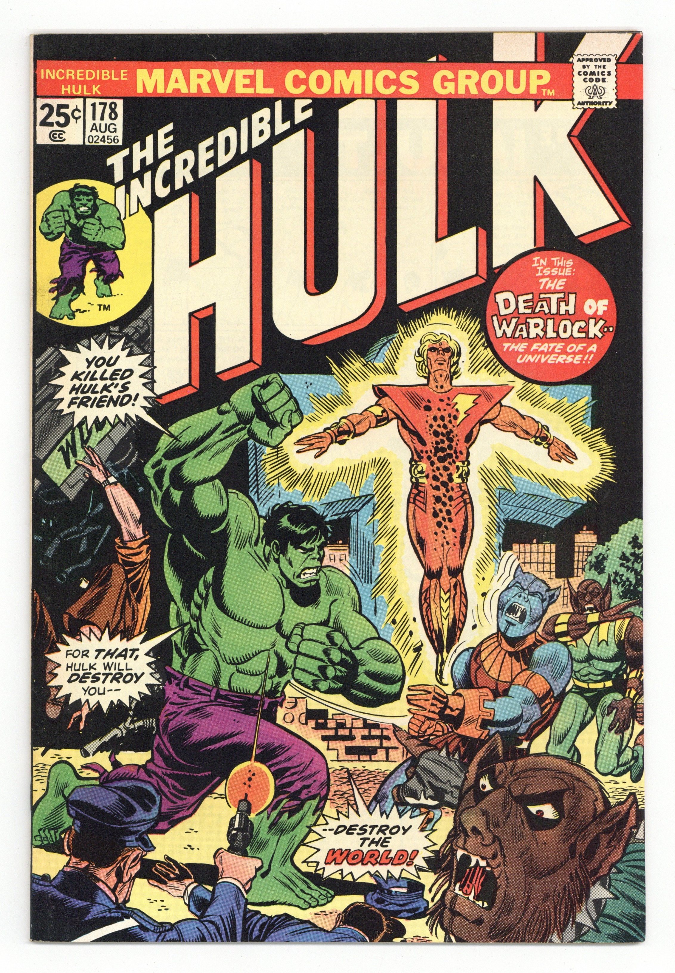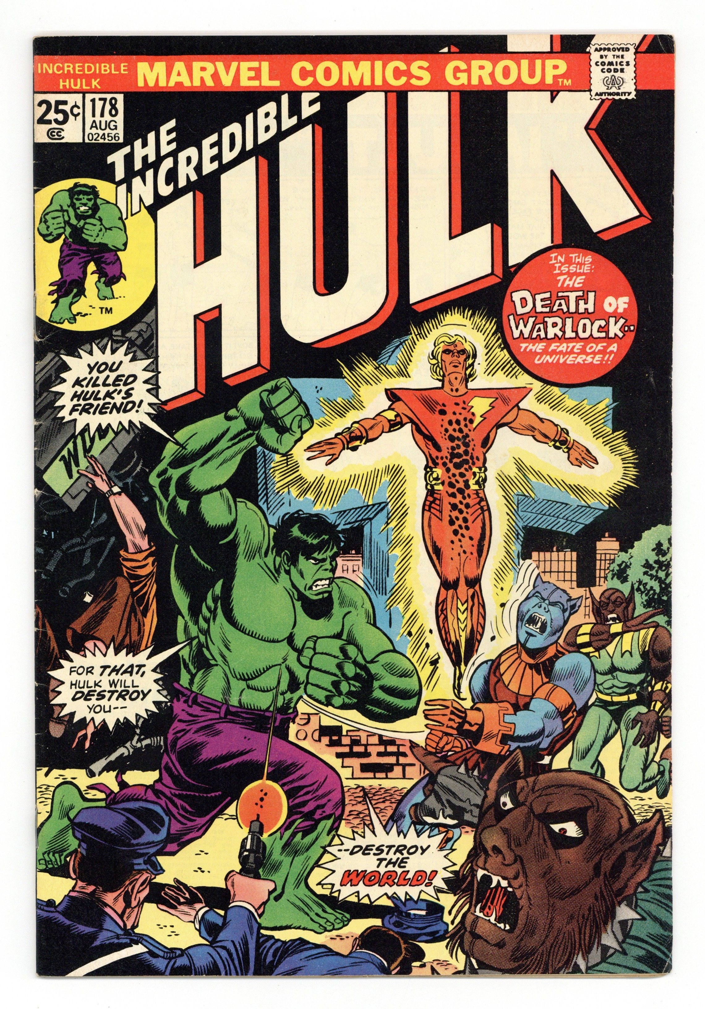 Tags: Marvel Legacy Numbering: Hulk (part 178), Hulk$40.00Cover art by Herb Trimpe and John Romita (alterations). "Triumph On Terra-Two," script by Roy Thomas, Gerry Conway, and Tony Isabella, pencils by Herb Trimpe, inks by Jack Abel; Hulk is reverted back to Bruce Banner by an act of brute force; Banner can only watch in horror as the Counter-Earth battle rages on in D.C. Who is the madman posturing as President of Counter-Earth?; And will Hulk be able to save his friend Adam Warlock from certain execution? The Warlock story continues in Strange Tales 178. 36 pgs., full color. $0.25. Cover price $0.25.