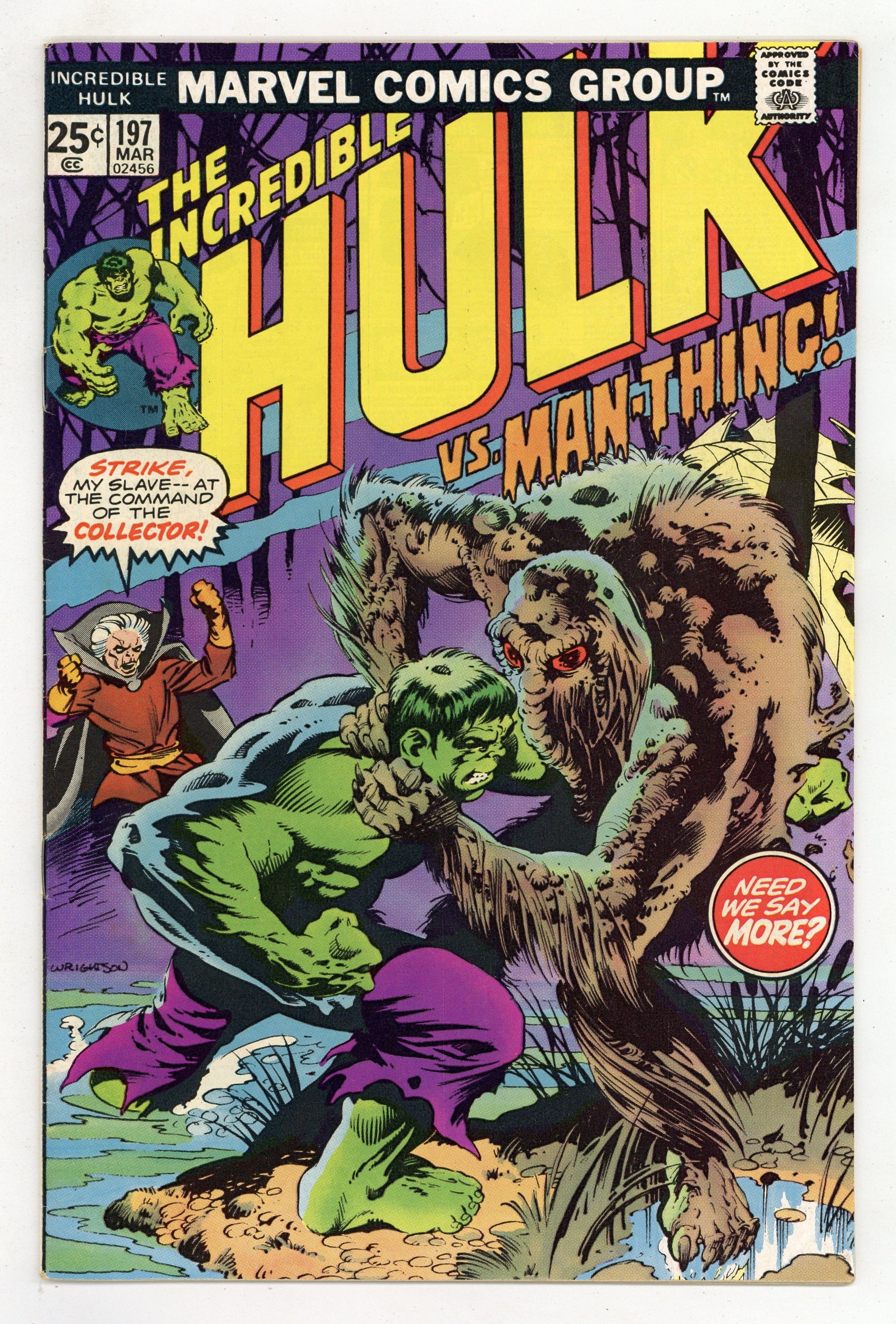 Tags: Marvel Legacy Numbering: Hulk (part 197), Hulk$80.00Cover by Bernie Wrightson. "...And Man-Thing Makes Three!," script by Len Wein, pencils by Sal Buscema (breakdowns) and Joe Staton (finished art), inks by Joe Staton; Following his battle with the Abomination, the Hulk finds himself in the Florida Everglades, and he is not happy; As he tromps through the swamp he is completely unaware that his presence has attracted the attention of the Man-Thing, who watches the brute silently; The Hulk is attacked by various alligators and snakes, prompting the Hulk to angrily ball them up and toss them away; He then stumbles across the ruins of Omegaville; The Hulk battles the Man-Thing. Guest-starring Doc Samson, the Glob, the Collector, and Cap'n Cutlass (Horatio Cutlass). Marvel Value Stamp series B #51. 36 pgs., full color. $0.25. Cover price $0.25.