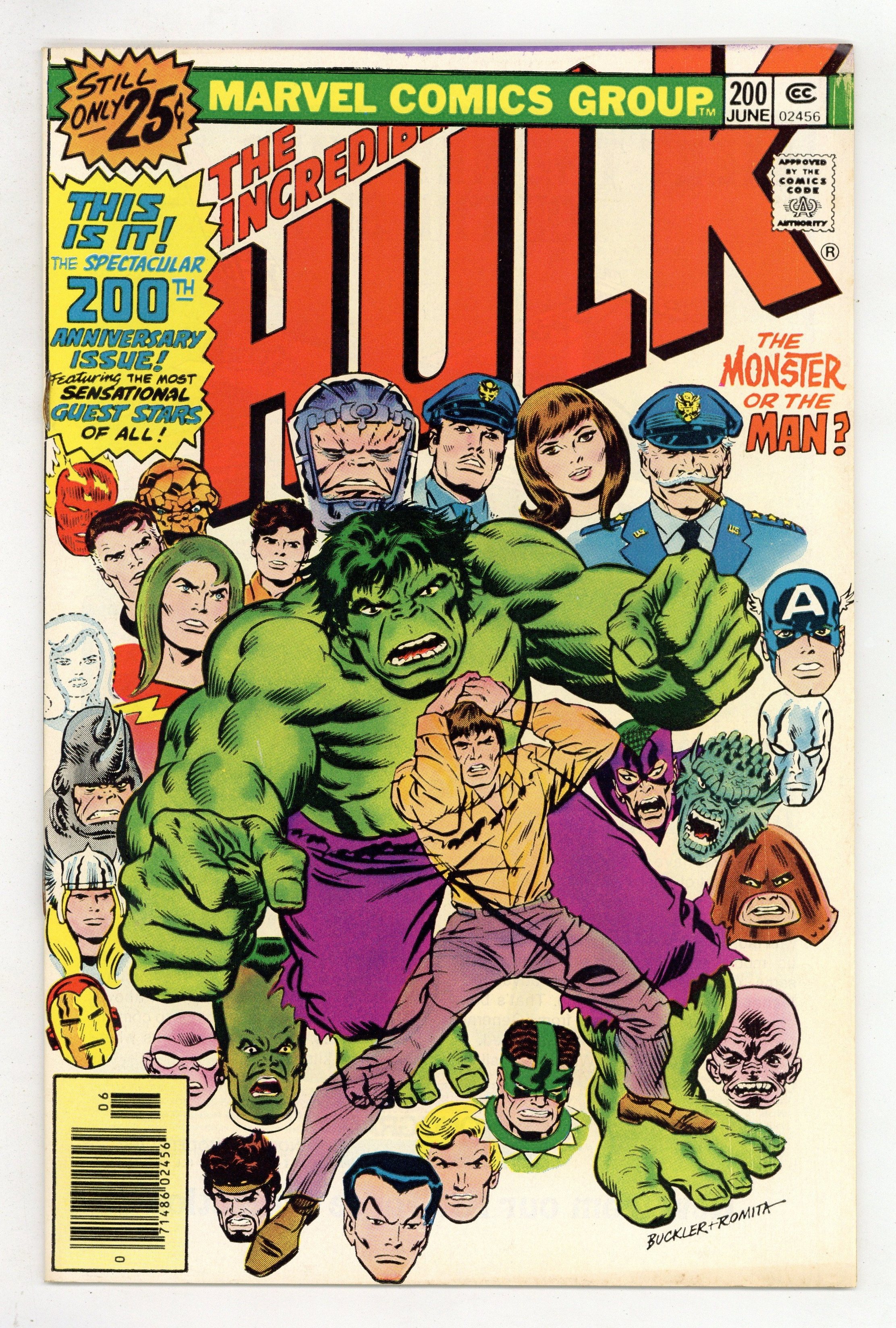 Cover pencils by Rich Buckler, inks by John Romita. An Intruder In the Mind!, script by Len Wein, pencils by Sal Buscema (layouts) and Joe Staton (finished art), inks by Joe Staton; Doc Samson shrinks the Hulk down so he can enter Glen Talbot's brain and try to restore his memories; While in Talbot's mind, the Hulk is attacked by a host of former friends and foes; Glen's memories are restored but Samson's machine accidentally shrinks the Hulk to nothingness. Marvel Value Stamp Series B #25: Spider-Man. 36 pgs. $0.25. Cover price $0.25.