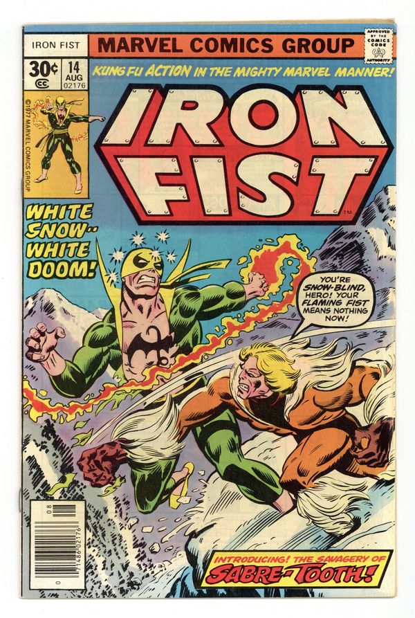 1st appearance of Sabretooth - next appearance is in Power Man and Iron Fist # 66. "Snowfire!" Guest-starring Colleen Wing. Story by Chris Claremont. Art by John Byrne and Dan Green. Cover by Dave Cockrum, and Al Milgrom. Lost and wounded somewhere in the Canadian wilderness, Iron Fist must summon all his energy and skills to survive an encounter with the deadly man called Sabretooth. 36 pages, full color. Cover price $0.30.